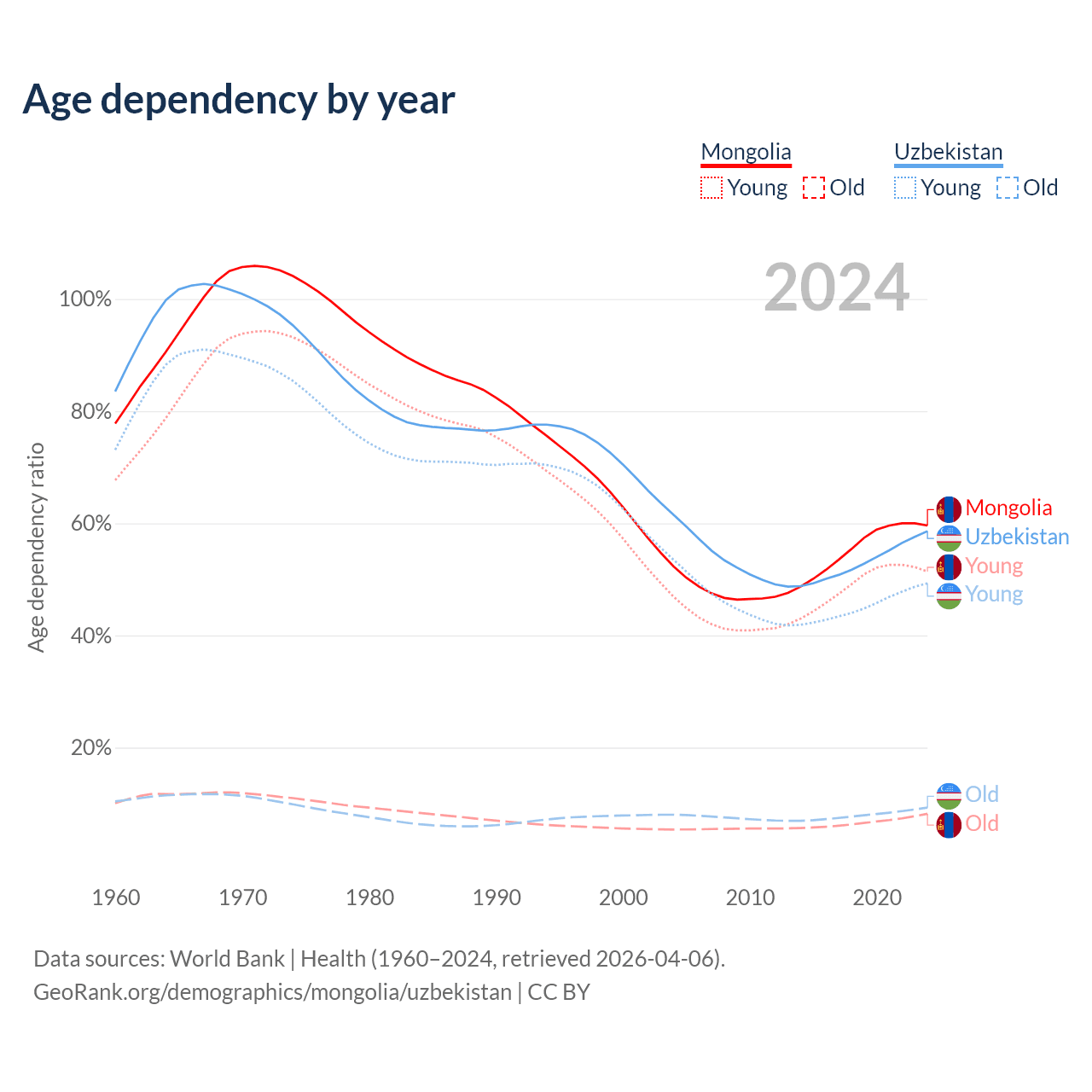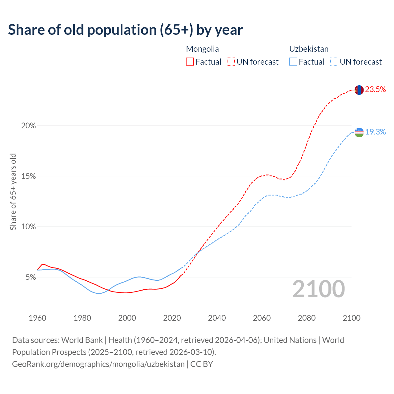 The share of older people aged 65 and over is 5.14% in Mongolia and 5.86% in Uzbekistan. Life expectancy in Mongolia compared to Uzbekistan .