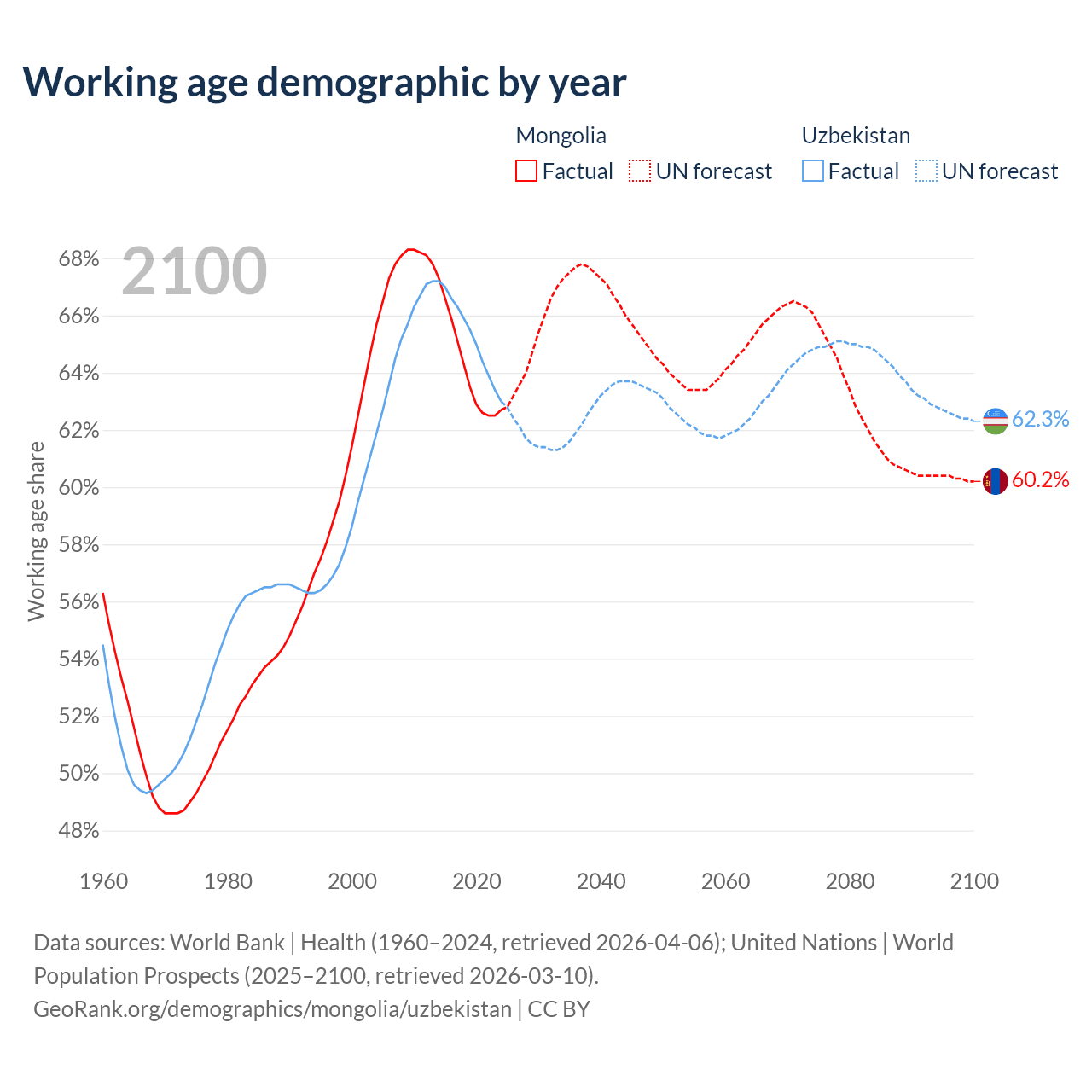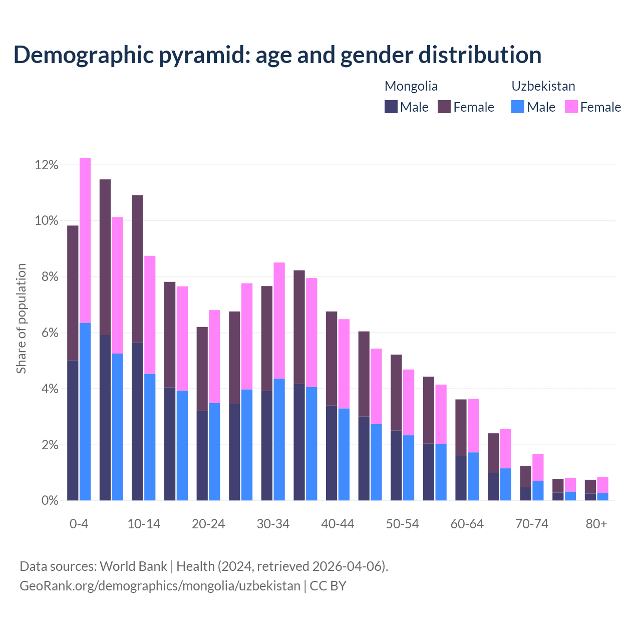 - As of 2026, the population of Mongolia is 3.62M vs 37.9M in Uzbekistan - 10.5 times difference.