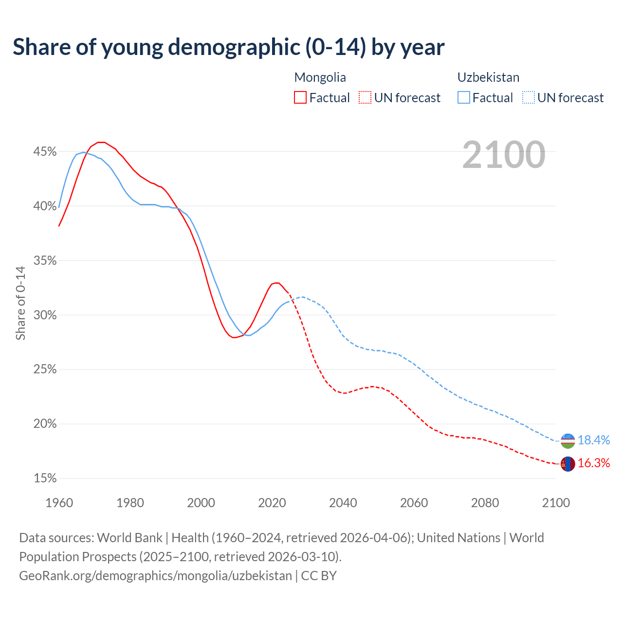 - The share of young demographic (0-15 years old) in Mongolia is 32.2% vs 31.1% in Uzbekistan.