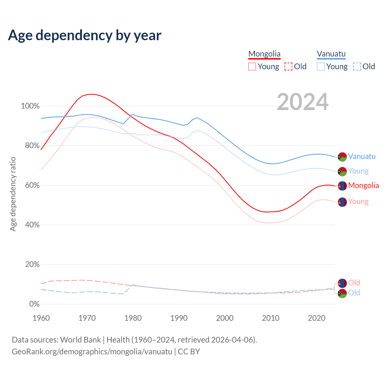 - Mongolia is ranked 117/196 by median age (oldest to youngest) vs 156/196 for Vanuatu.