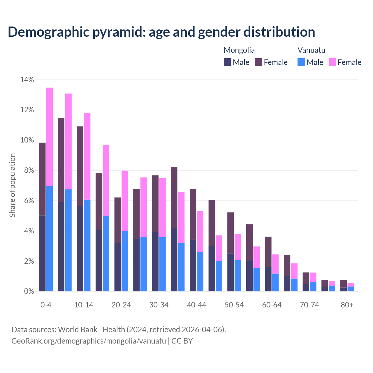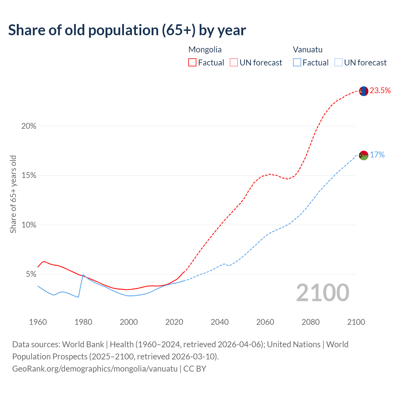The share of older people aged 65 and over is 5.14% in Mongolia and 4.3% in Vanuatu. Life expectancy in Mongolia compared to Vanuatu .