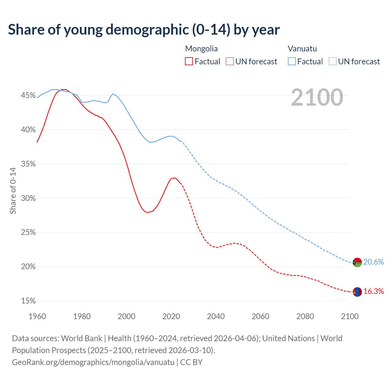 - The share of young demographic (0-15 years old) in Mongolia is 32.2% vs 38.3% in Vanuatu.