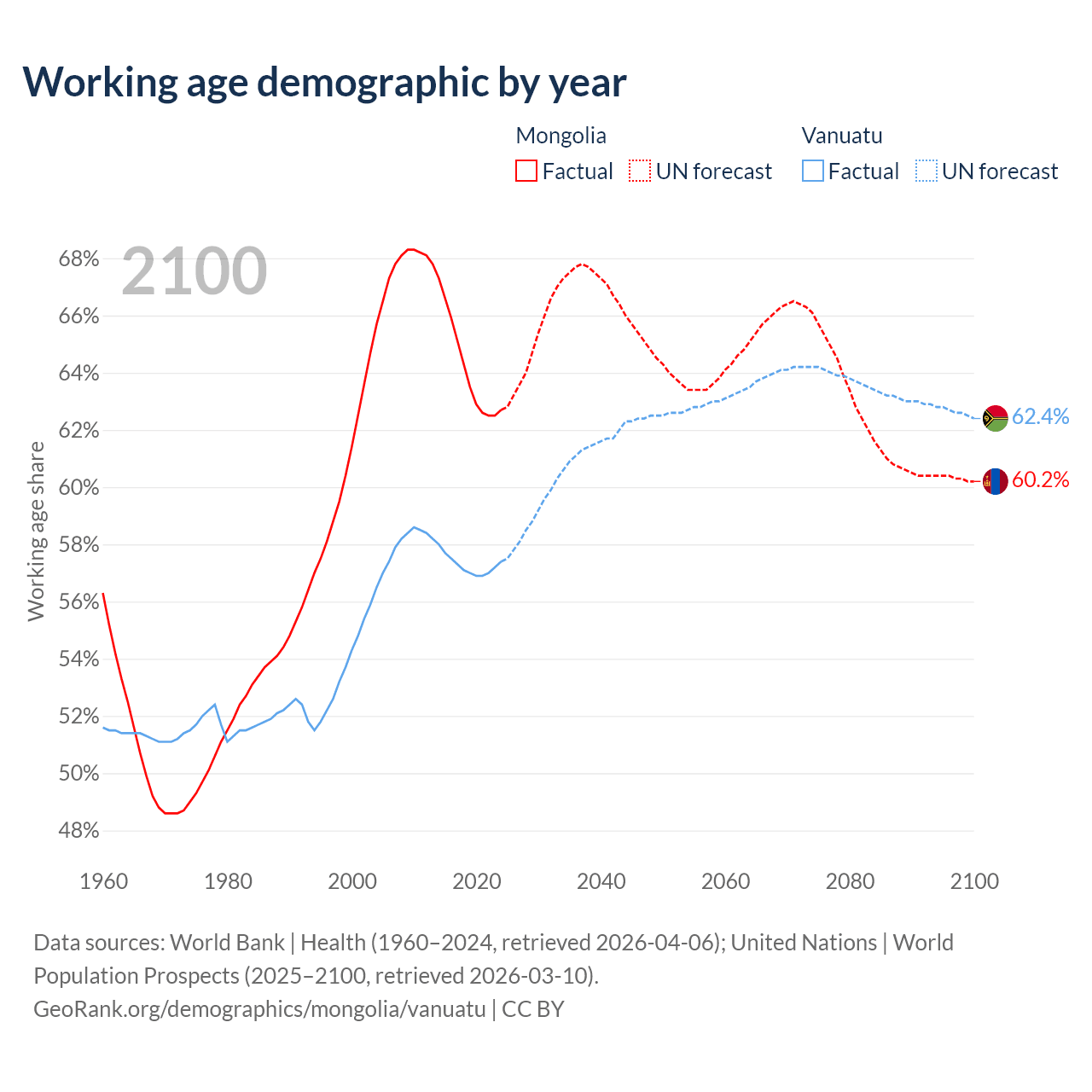 Median age Mongolia vs Vanuatu, 1960-2100