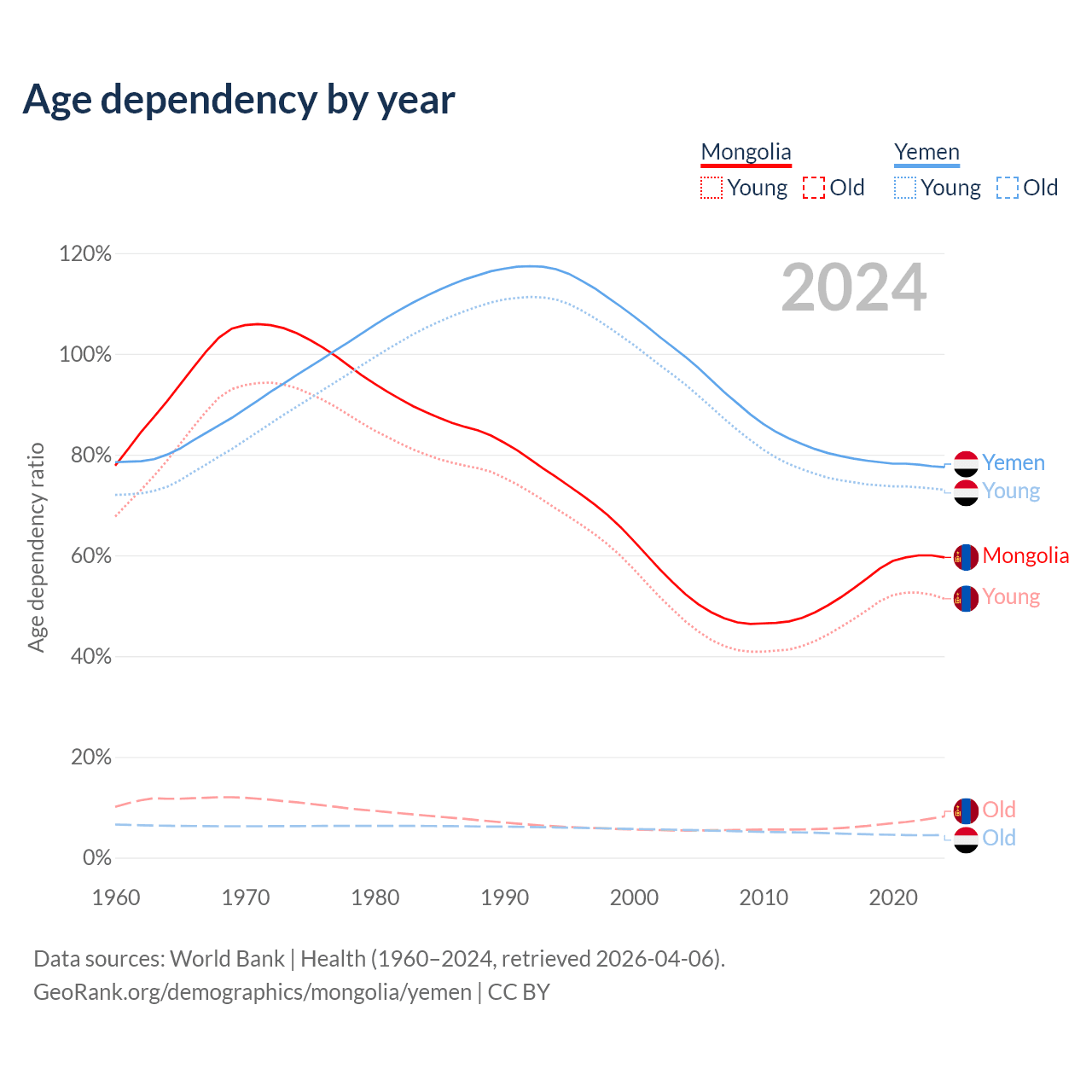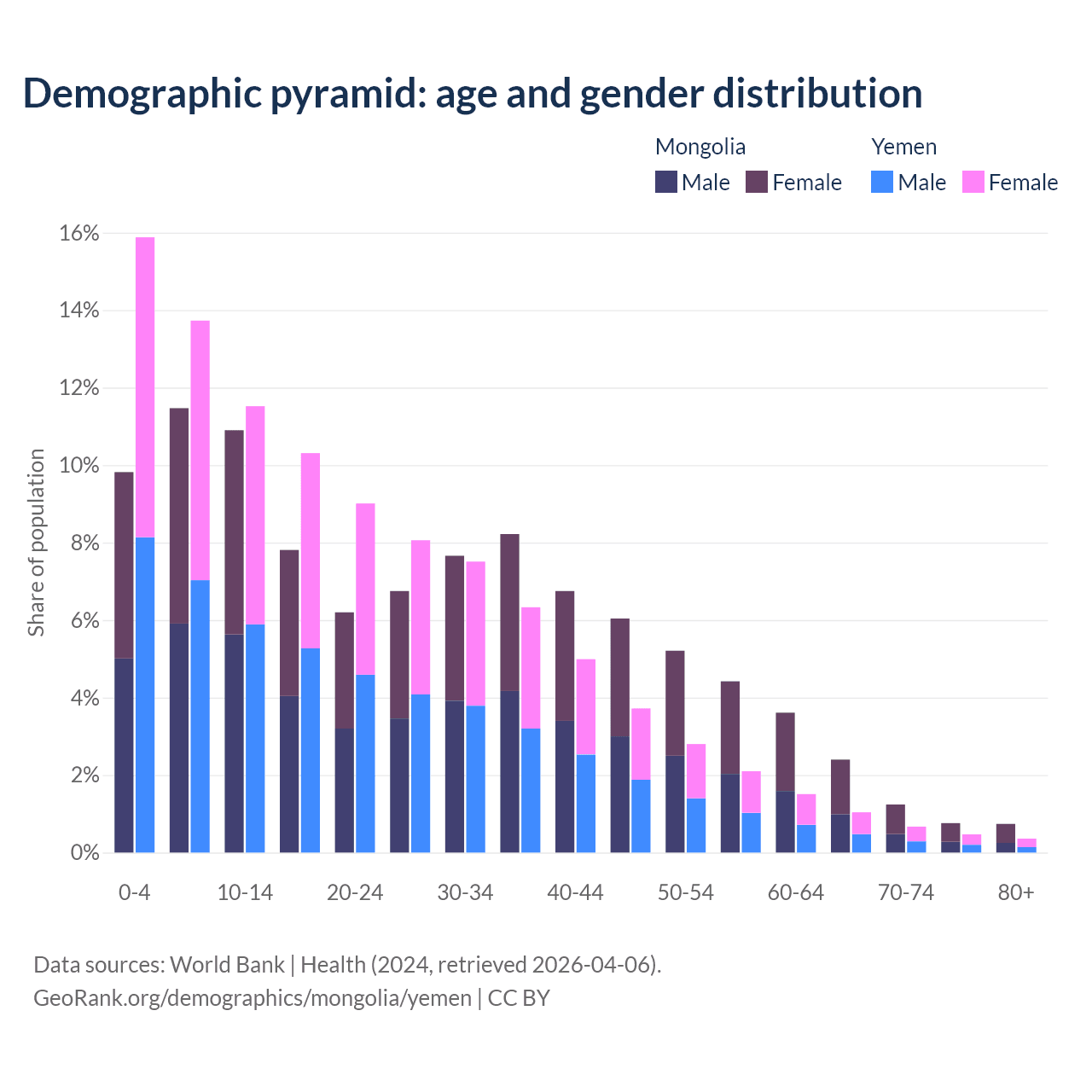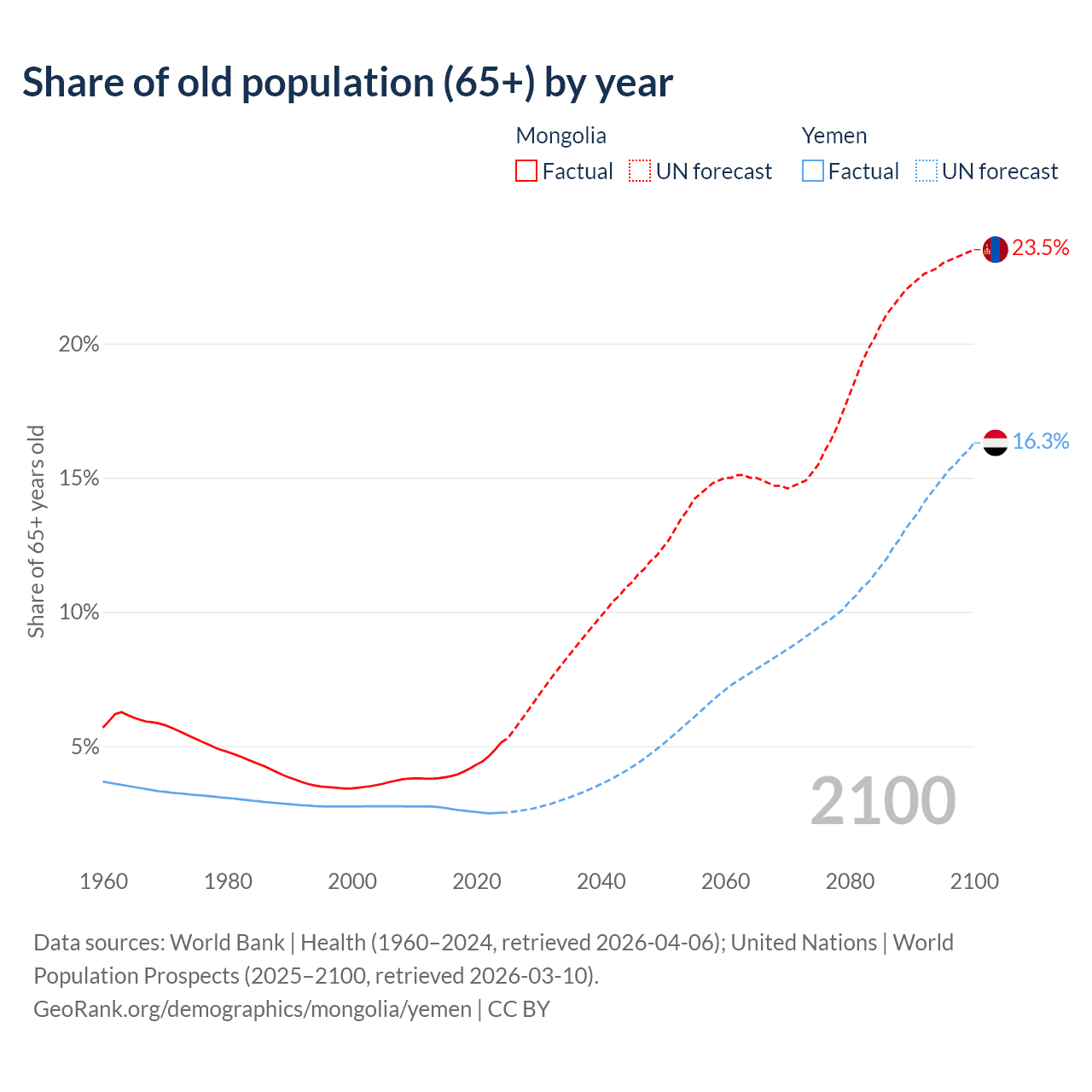 - The share of old-age demographic (65+) in Mongolia is 5.14% vs 2.52% in Yemen.