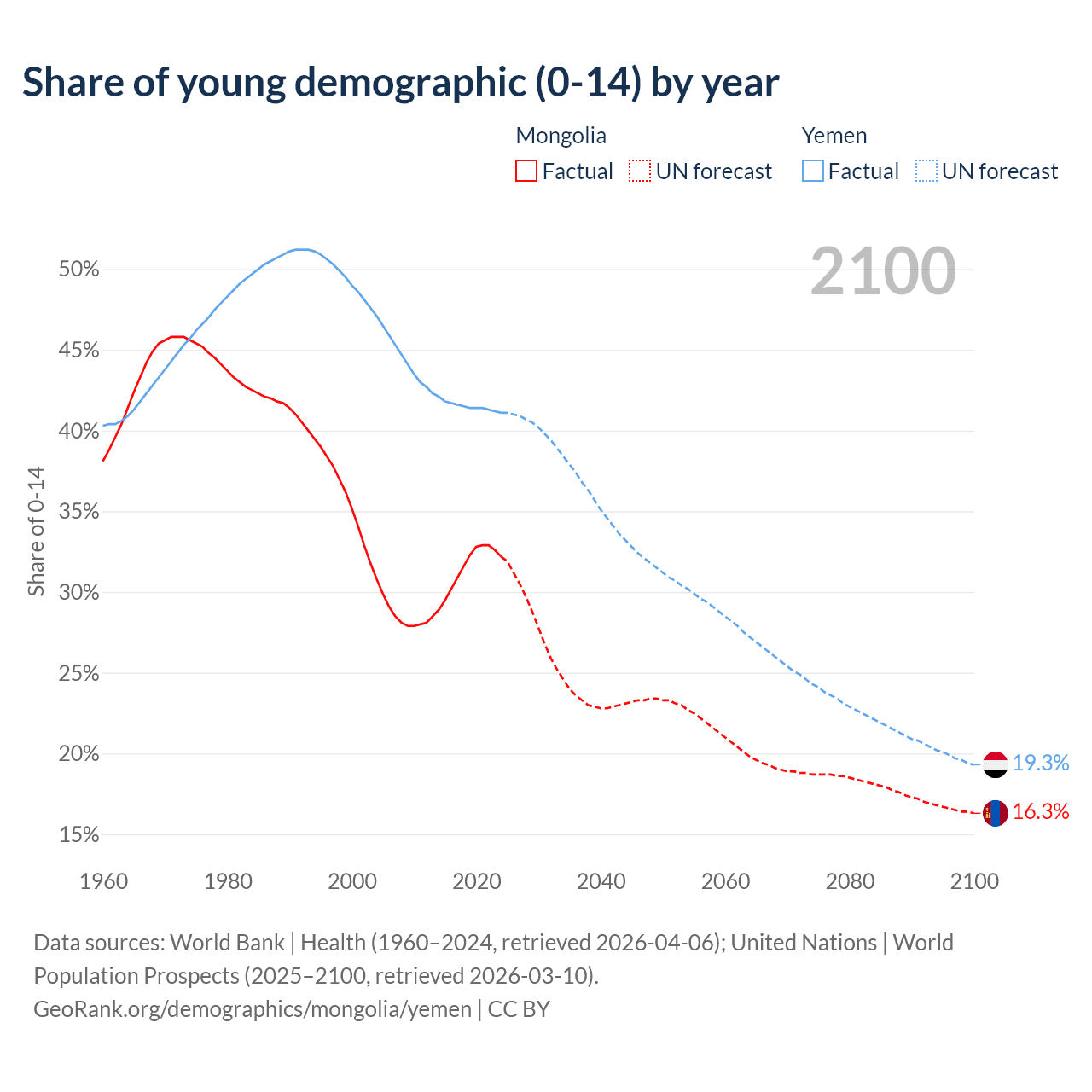 - The share of young demographic (0-15 years old) in Mongolia is 32.2% vs 41.1% in Yemen.