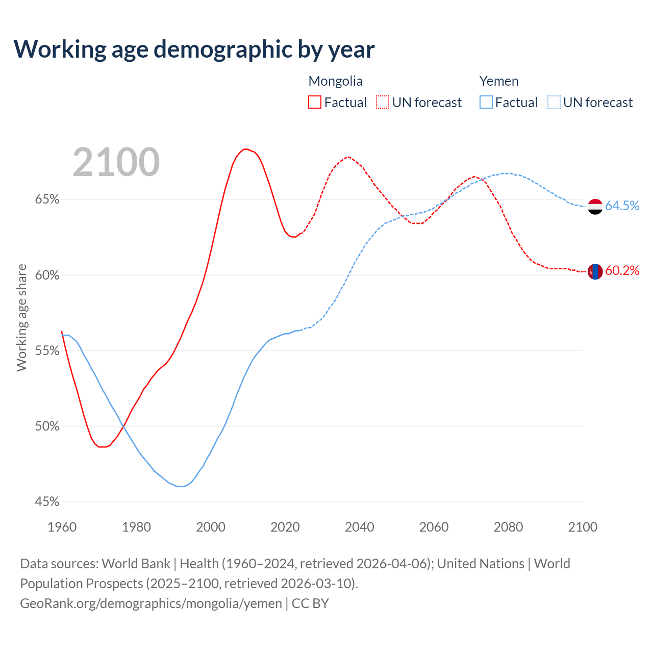 The share of older people aged 65 and over is 5.14% in Mongolia and 2.52% in Yemen. Life expectancy in Mongolia compared to Yemen .