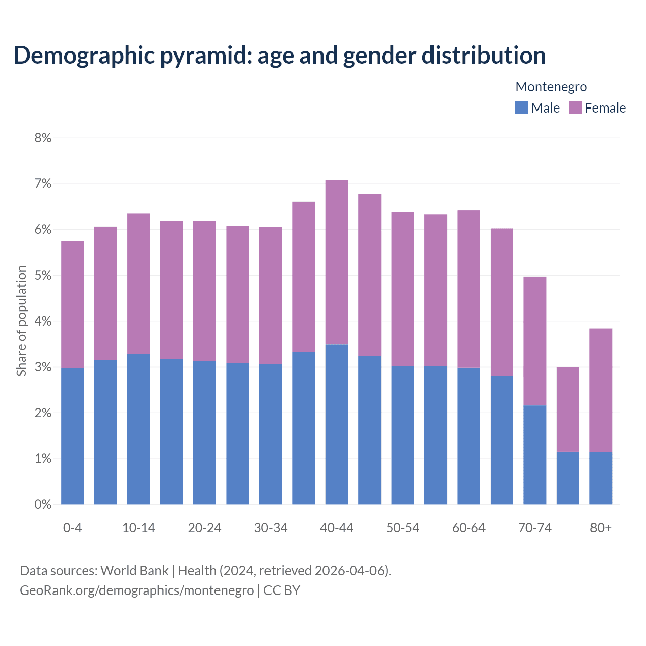 With a population of 624K people, Montenegro has a median age of 40.6 years which makes it the 45/196 oldest country. 18.1% of the demographic are children 0-14 years old, 64% are working-age people aged 15-64, and 17.8% are older population aged 65+ years.