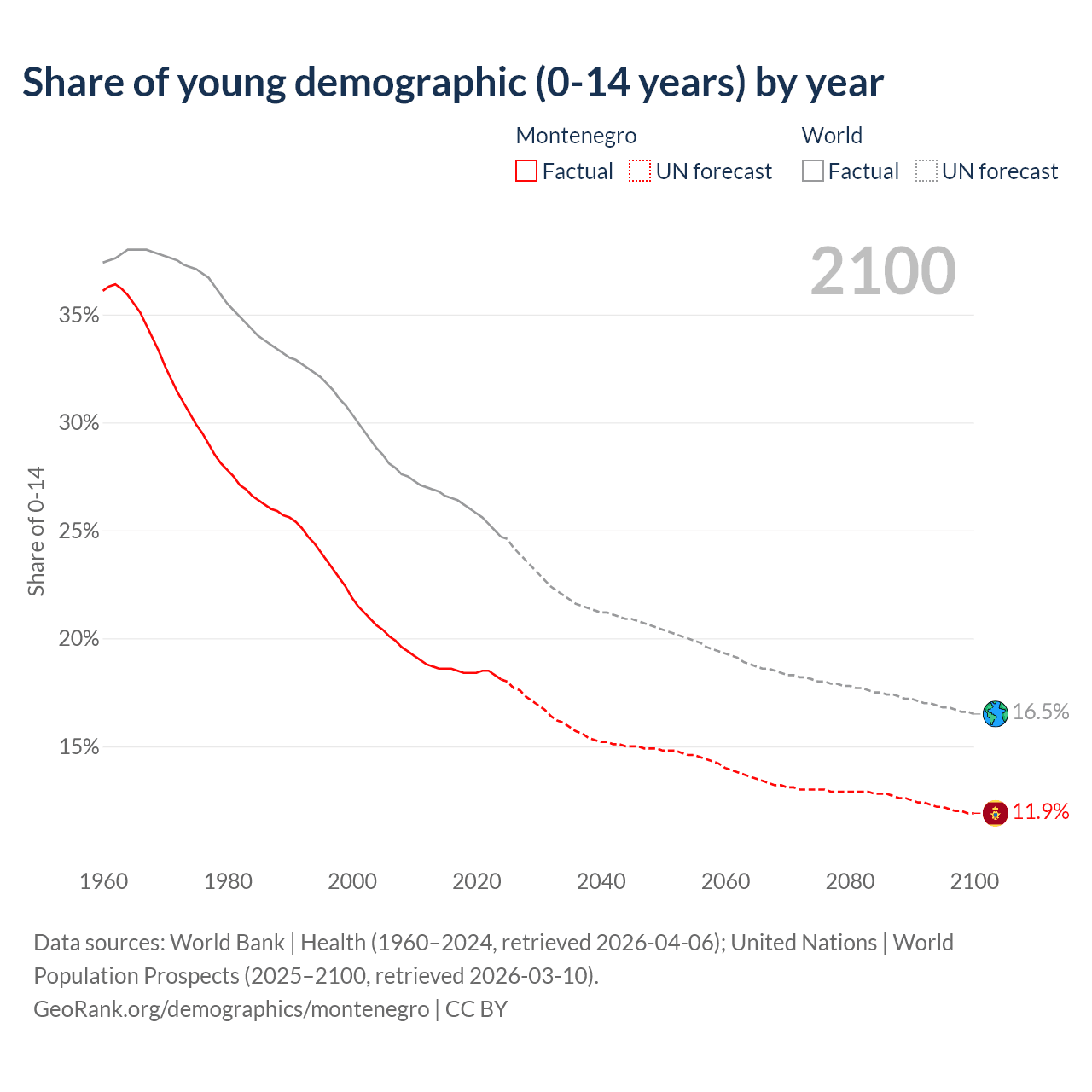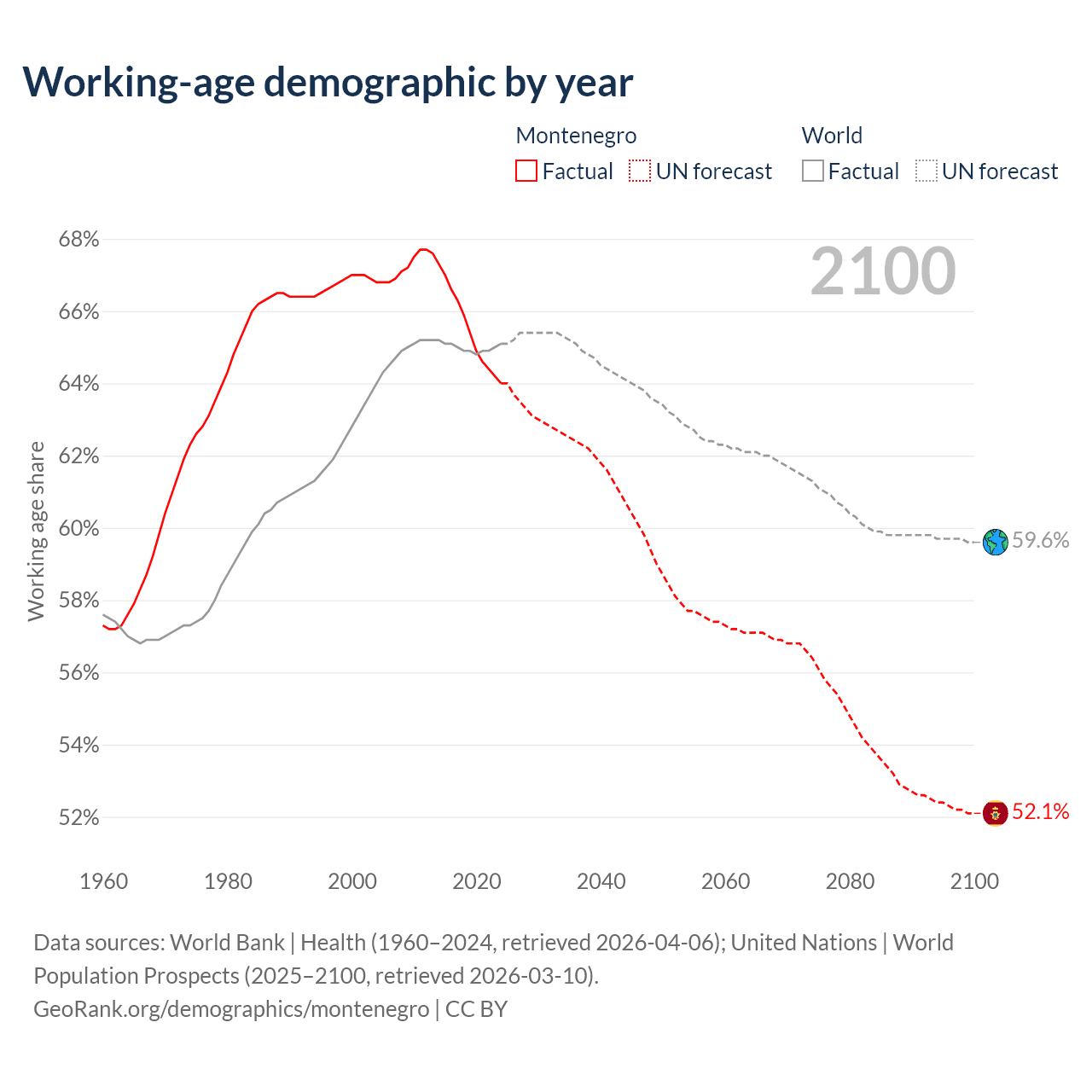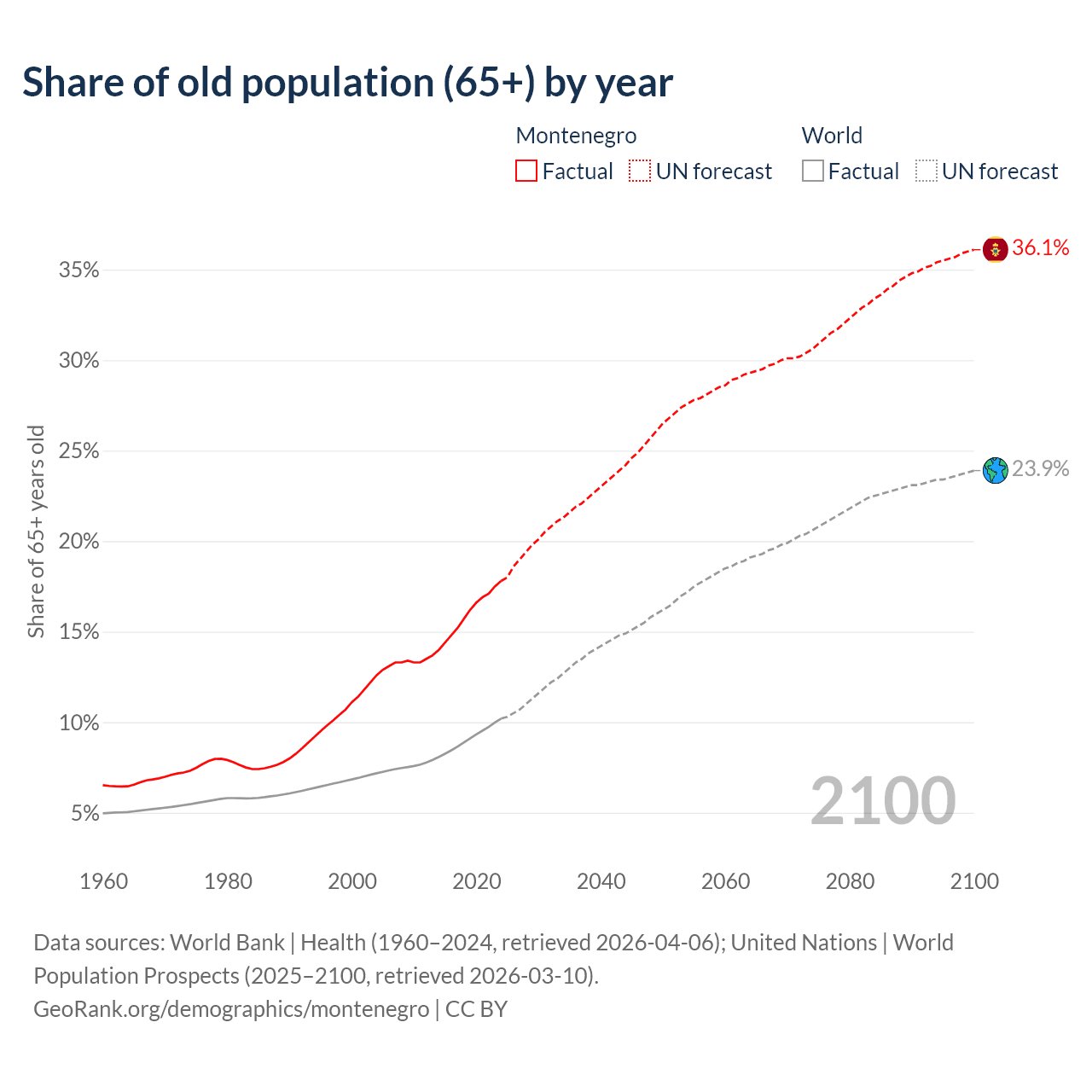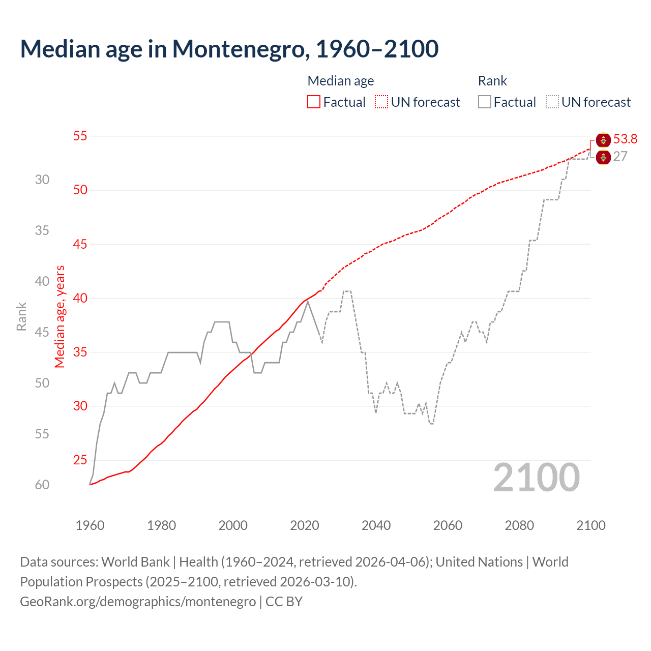 Median age in Montenegro, 1960–2100