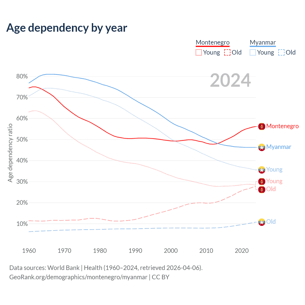 - The share of old-age demographic (65+) in Montenegro is 17.8% vs 7.3% in Myanmar.