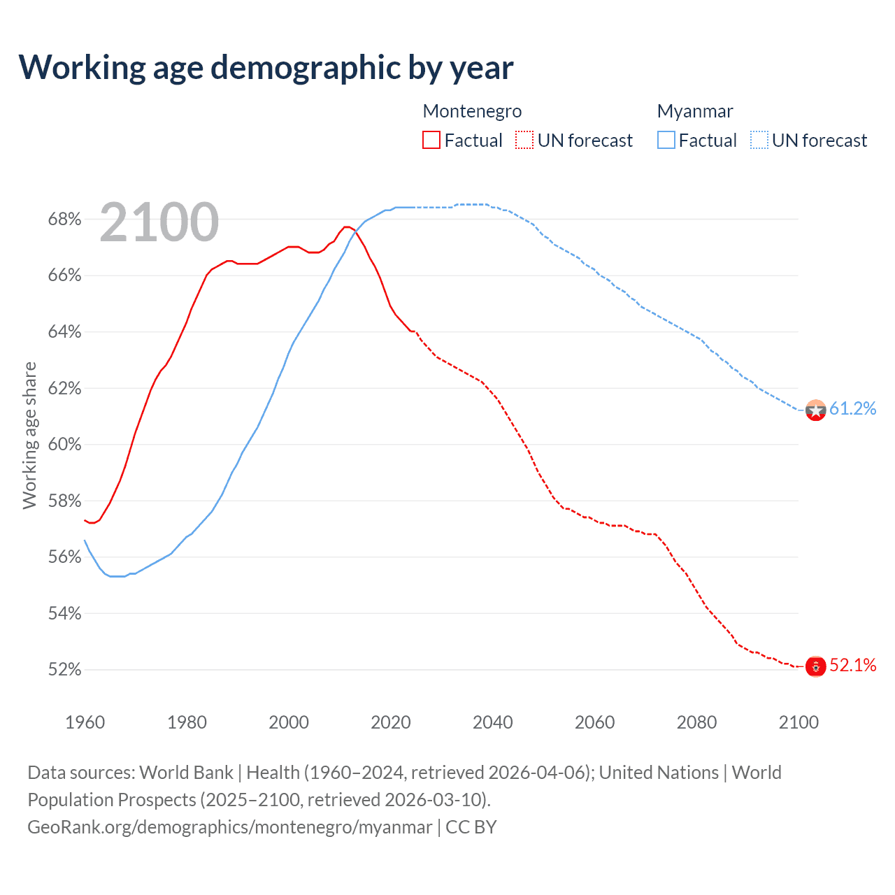 Median age Montenegro vs Myanmar, 1960-2100