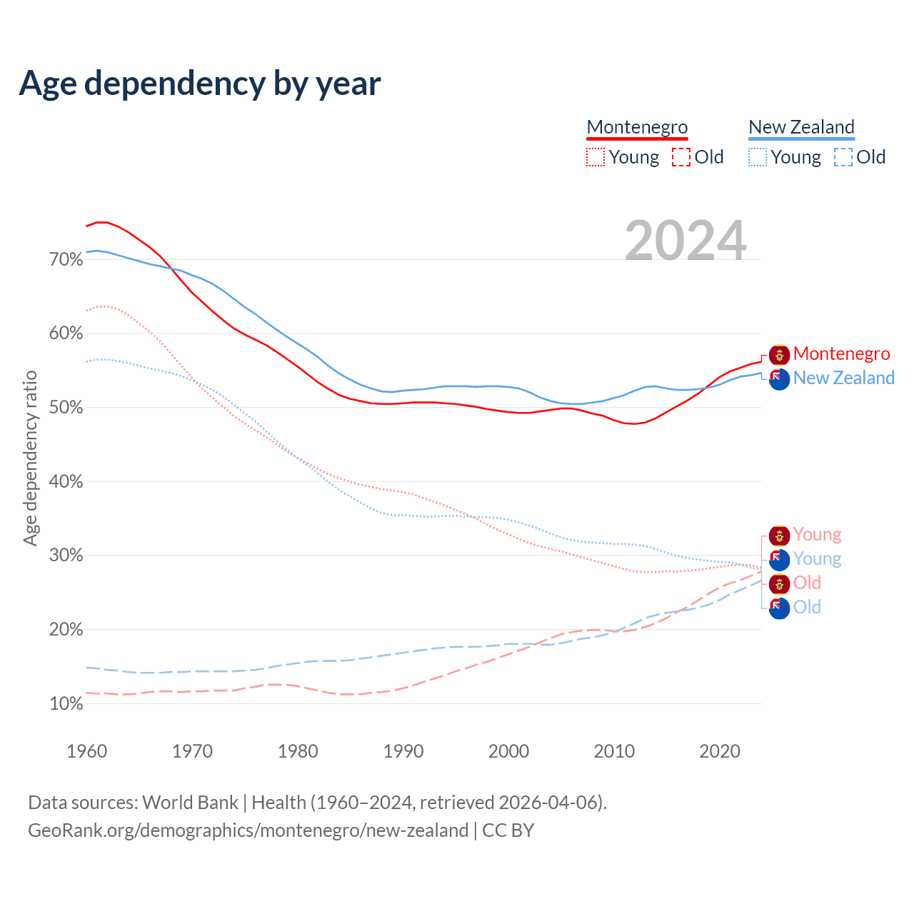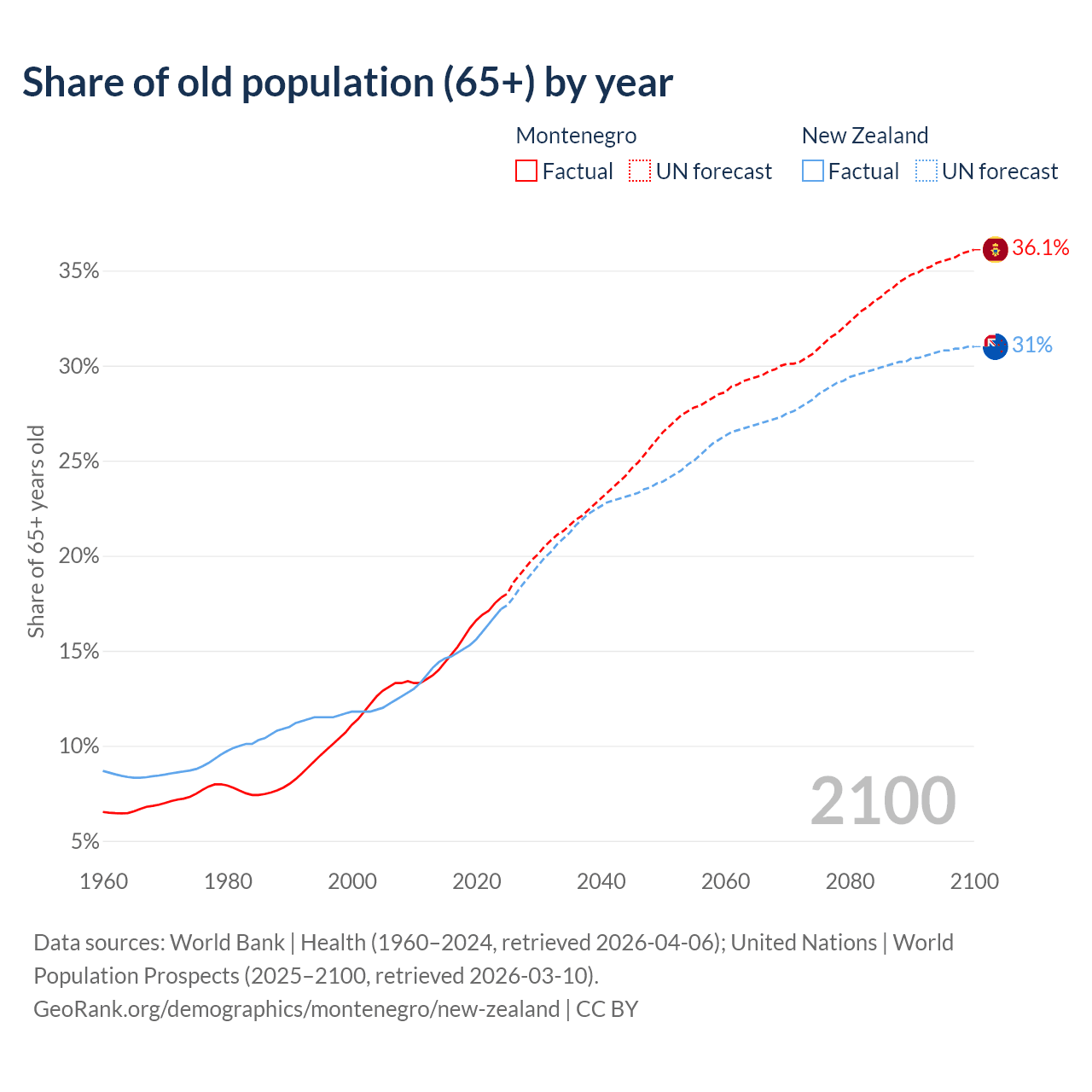 - The share of old-age demographic (65+) in Montenegro is 17.8% vs 17.2% in New Zealand.
