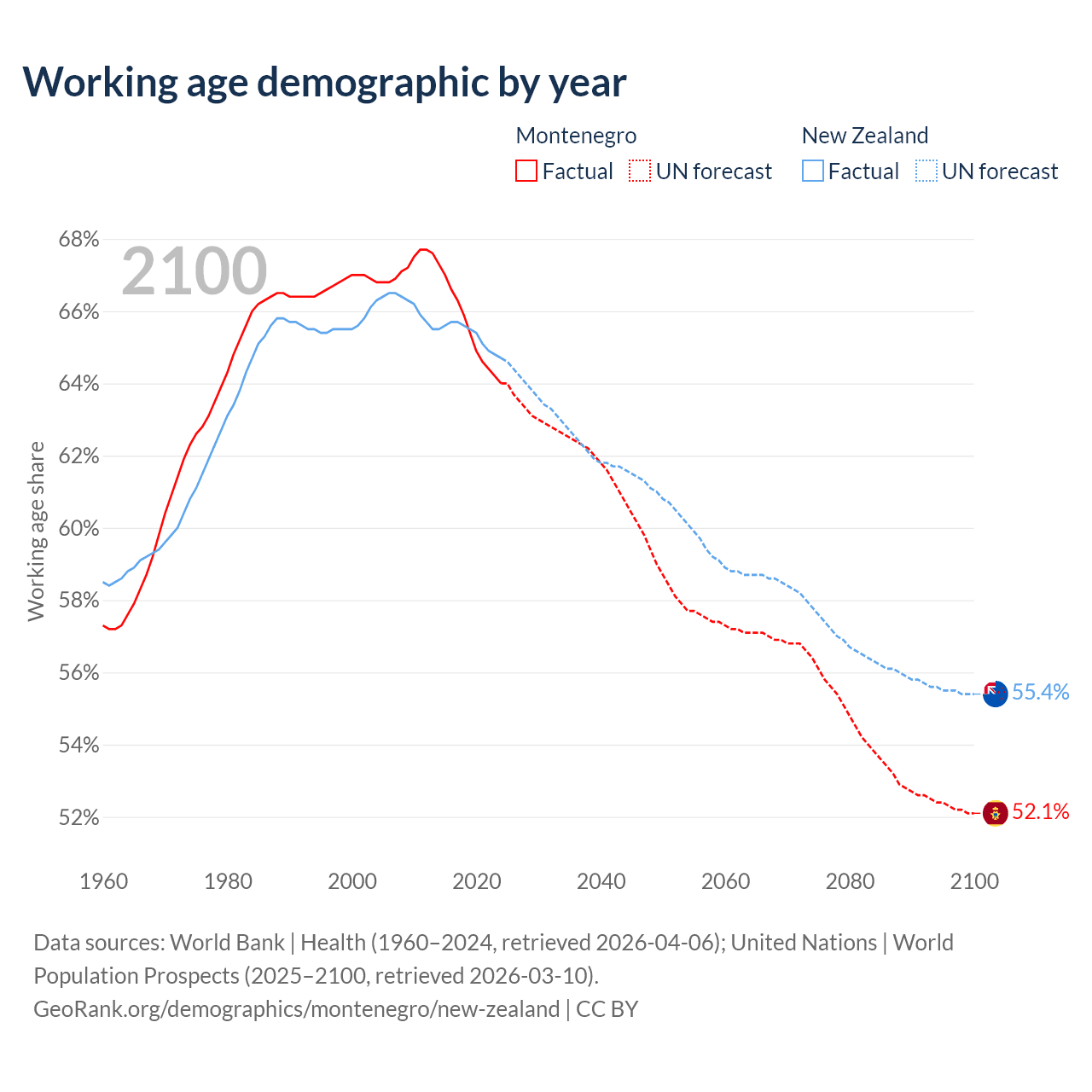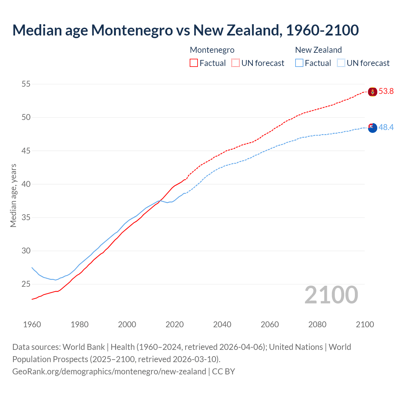 Median age Montenegro vs New Zealand, 1960-2100