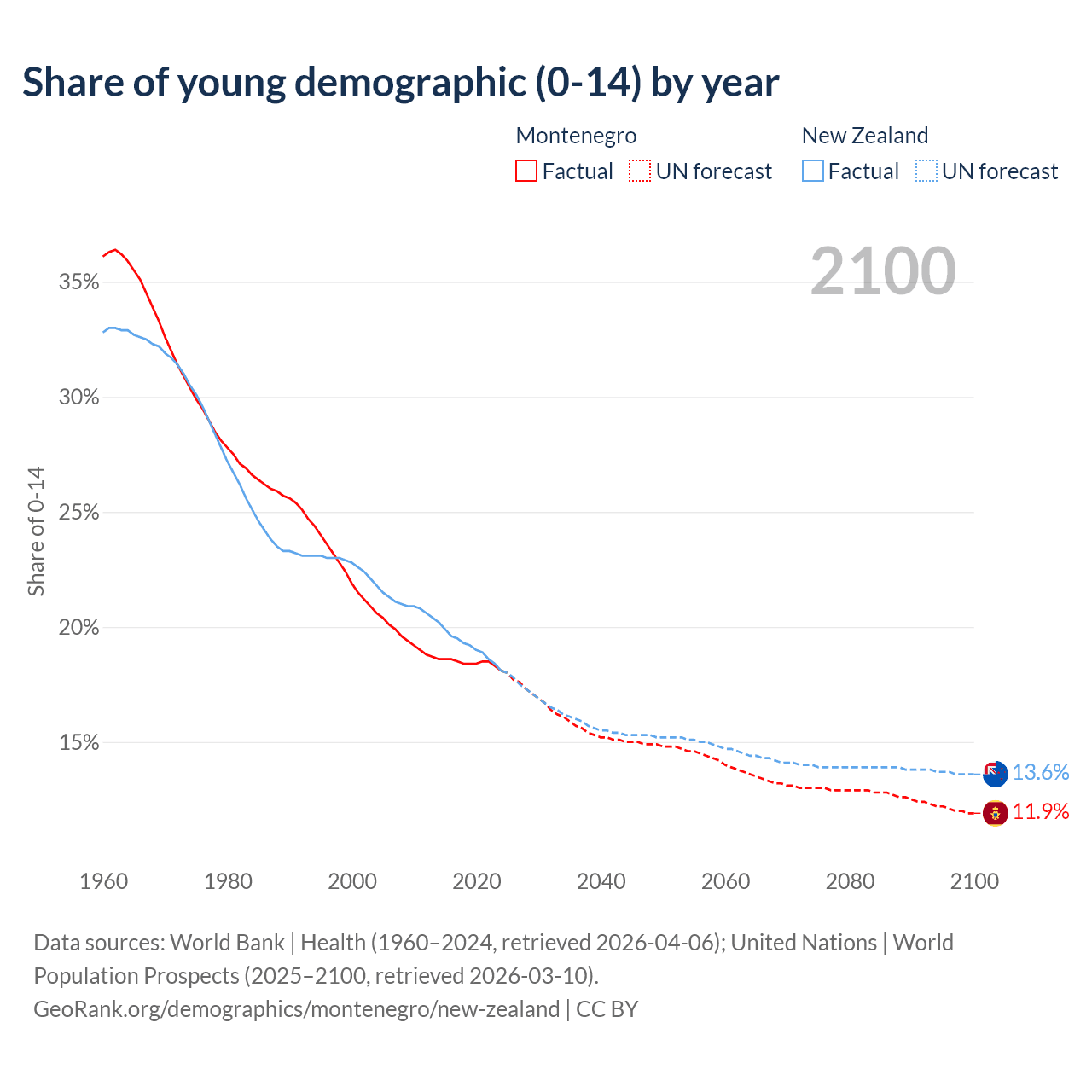 - The share of young demographic (0-15 years old) in Montenegro is 18.1% vs 18.1% in New Zealand.