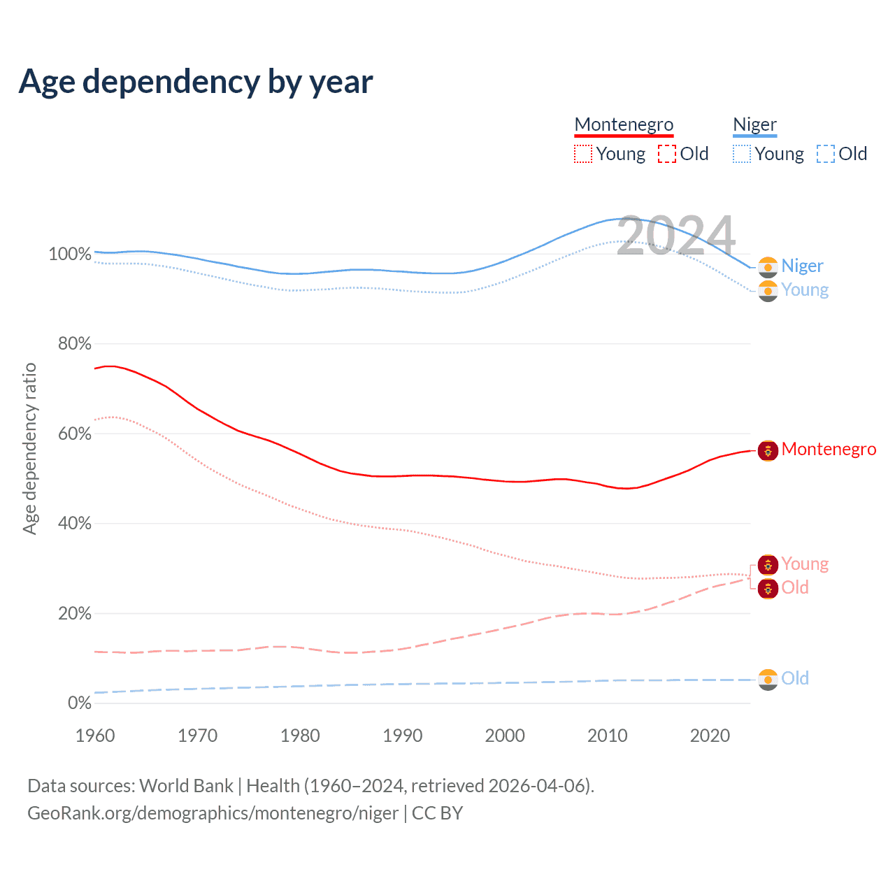 - The share of young demographic (0-15 years old) in Montenegro is 18.1% vs 46.6% in Niger.