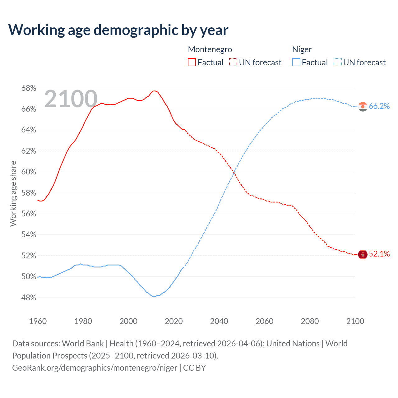 Median age Montenegro vs Niger, 1960-2100