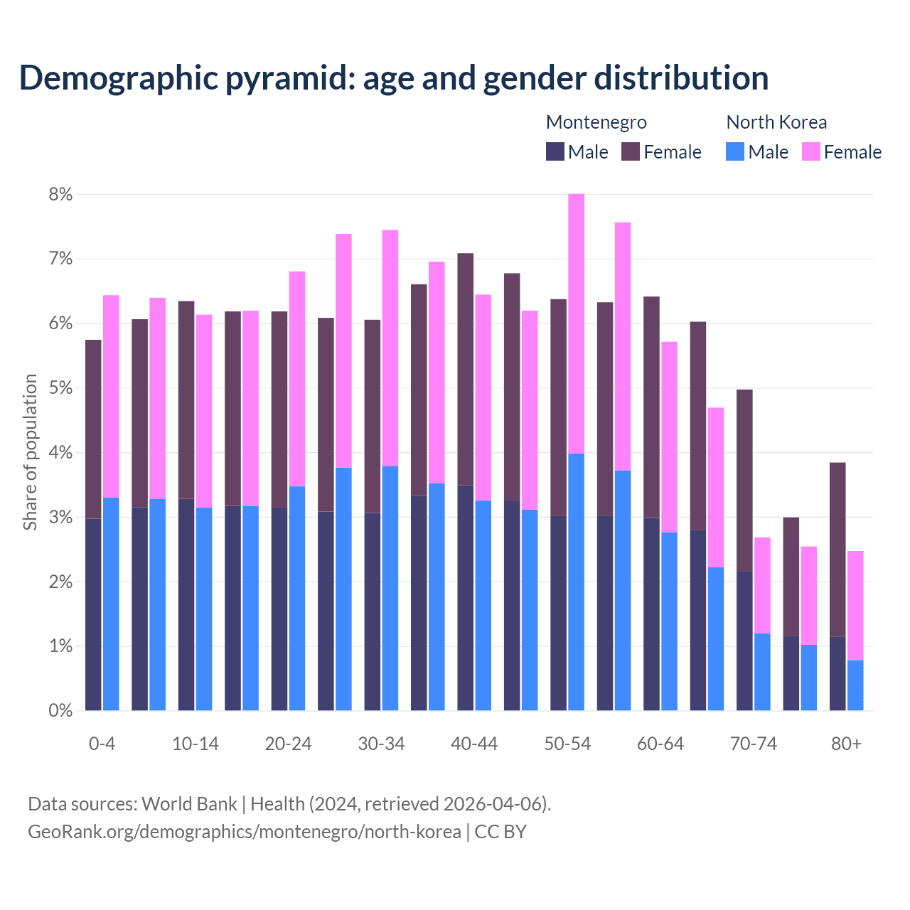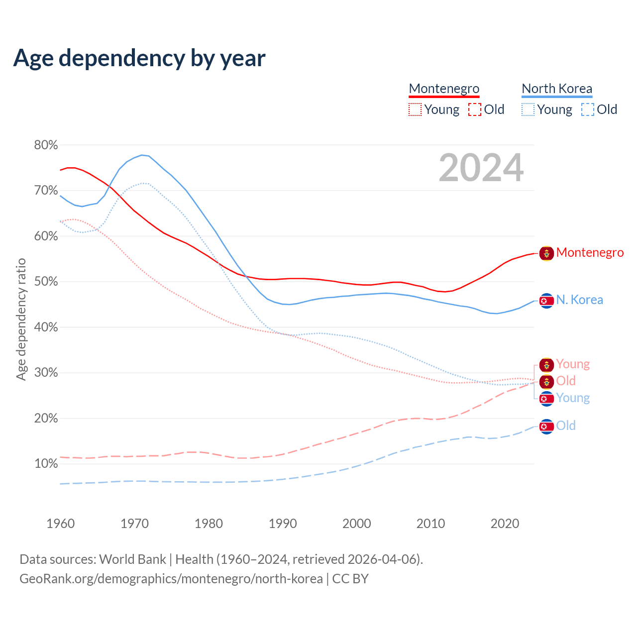 - The share of old-age demographic (65+) in Montenegro is 17.8% vs 12.4% in North Korea.