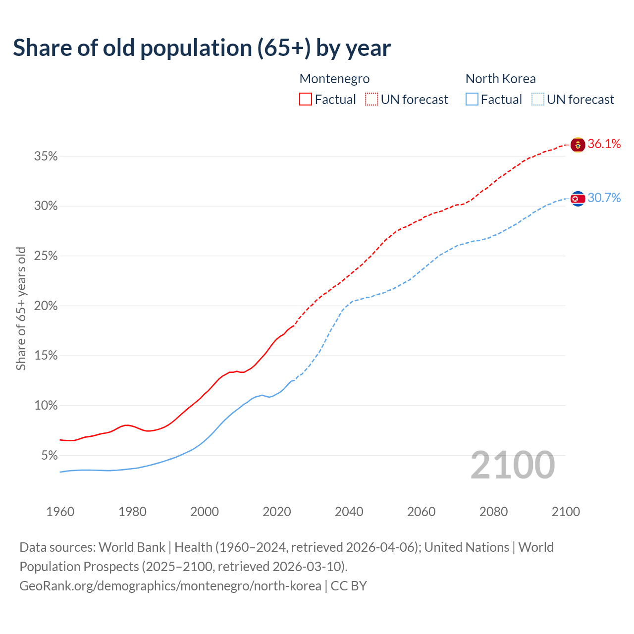 The share of older people aged 65 and over is 17.8% in Montenegro and 12.4% in North Korea. Life expectancy in Montenegro compared to North Korea .
