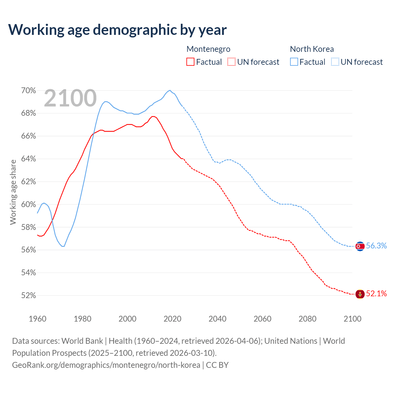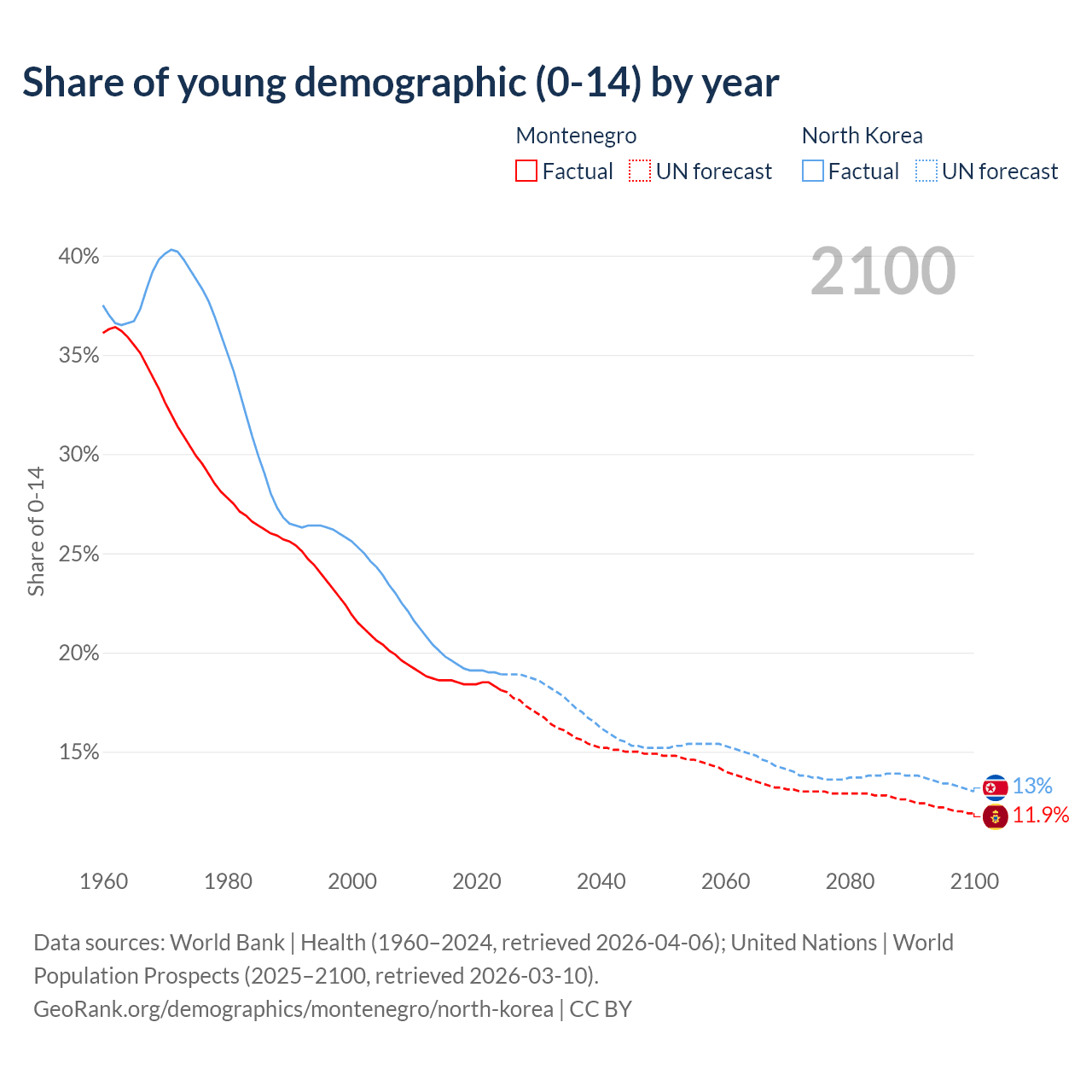 - The share of young demographic (0-15 years old) in Montenegro is 18.1% vs 18.9% in North Korea.