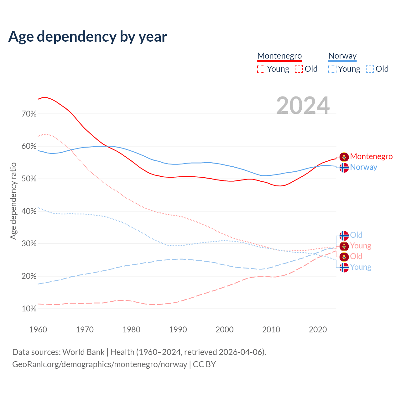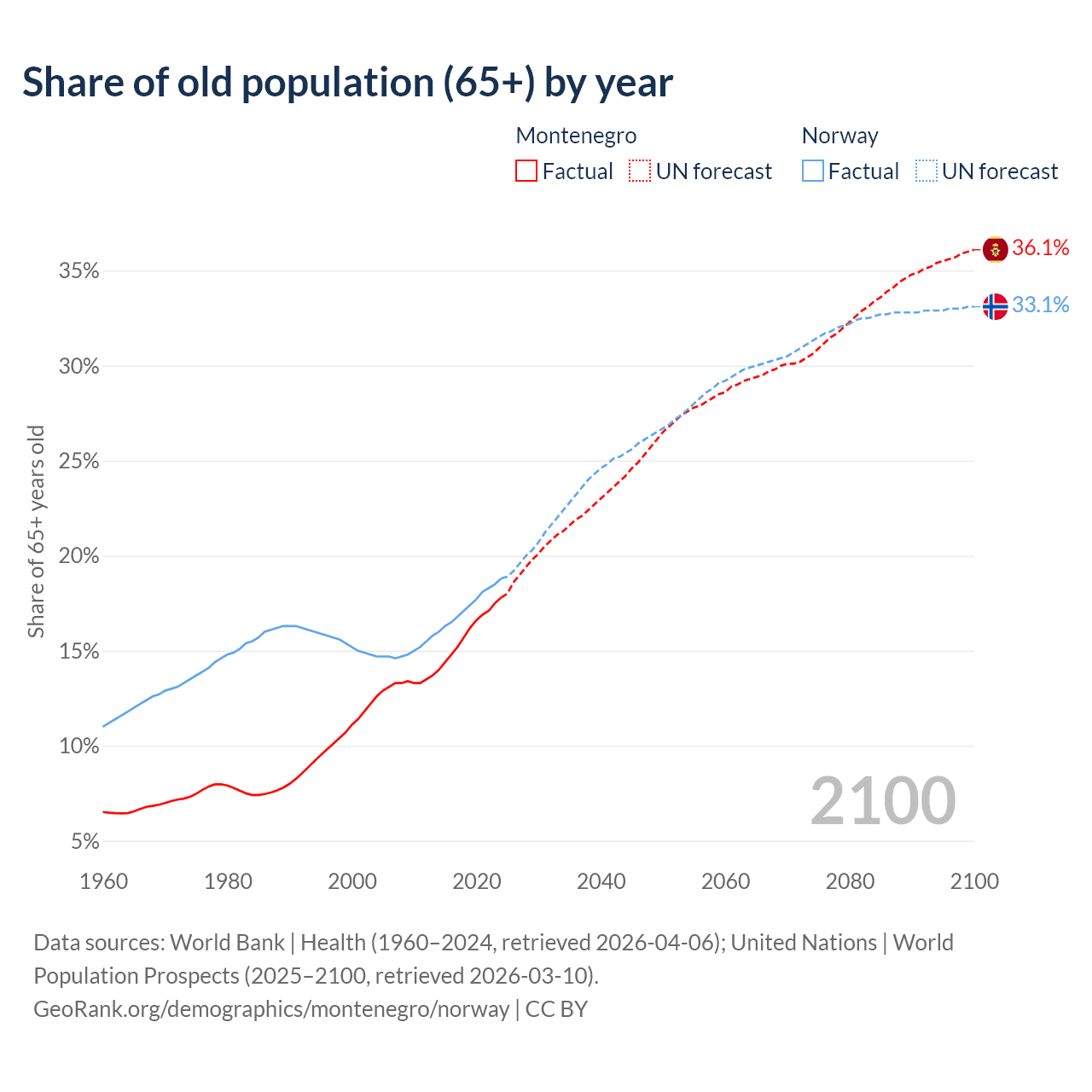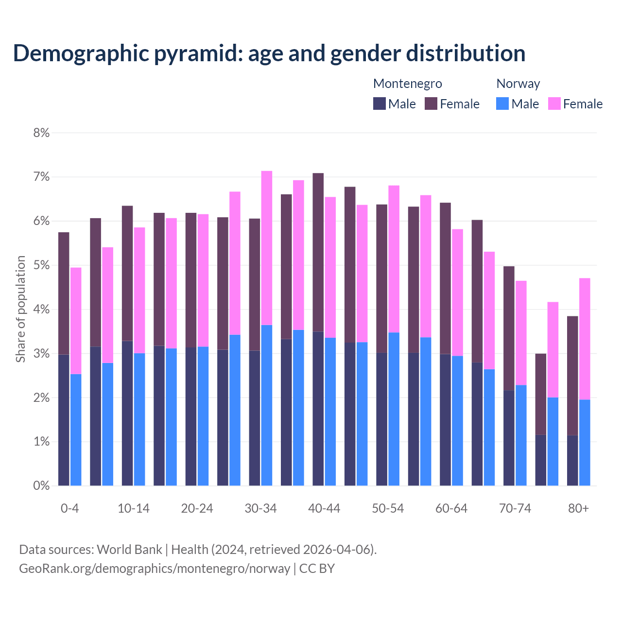 - Montenegro is ranked 45/196 by median age (oldest to youngest) vs 43/196 for Norway.
