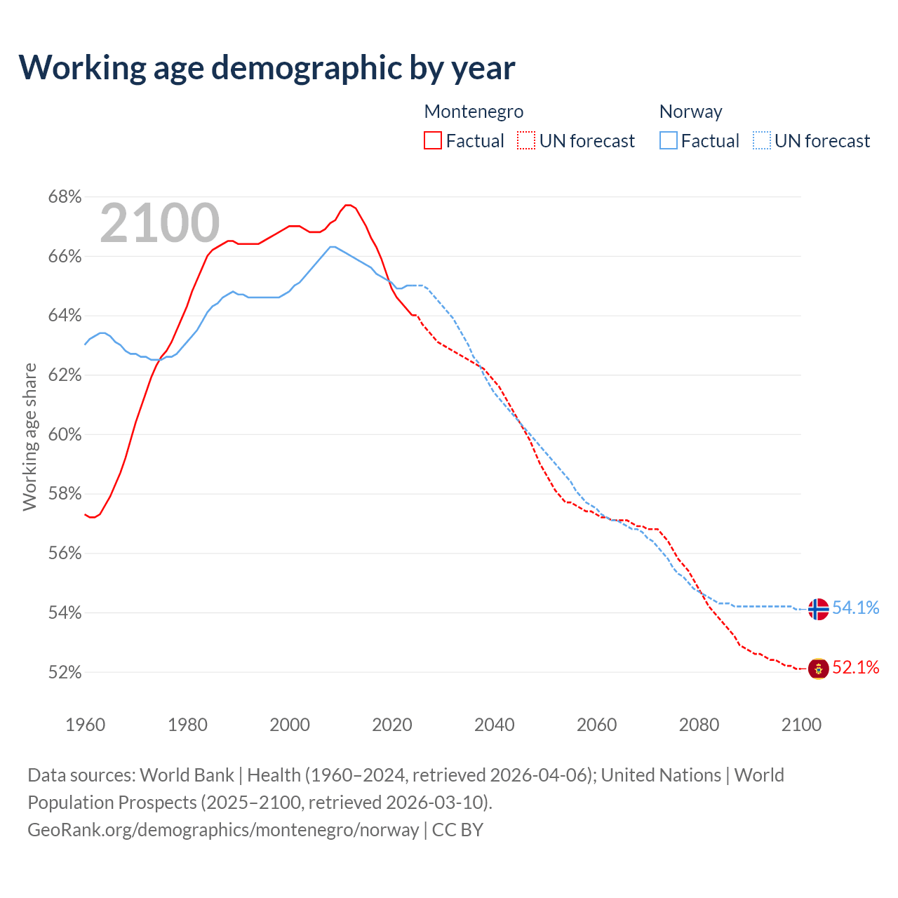 - Montenegro has 392K working age adults (aged 15-64) vs 3.69M in Norway.