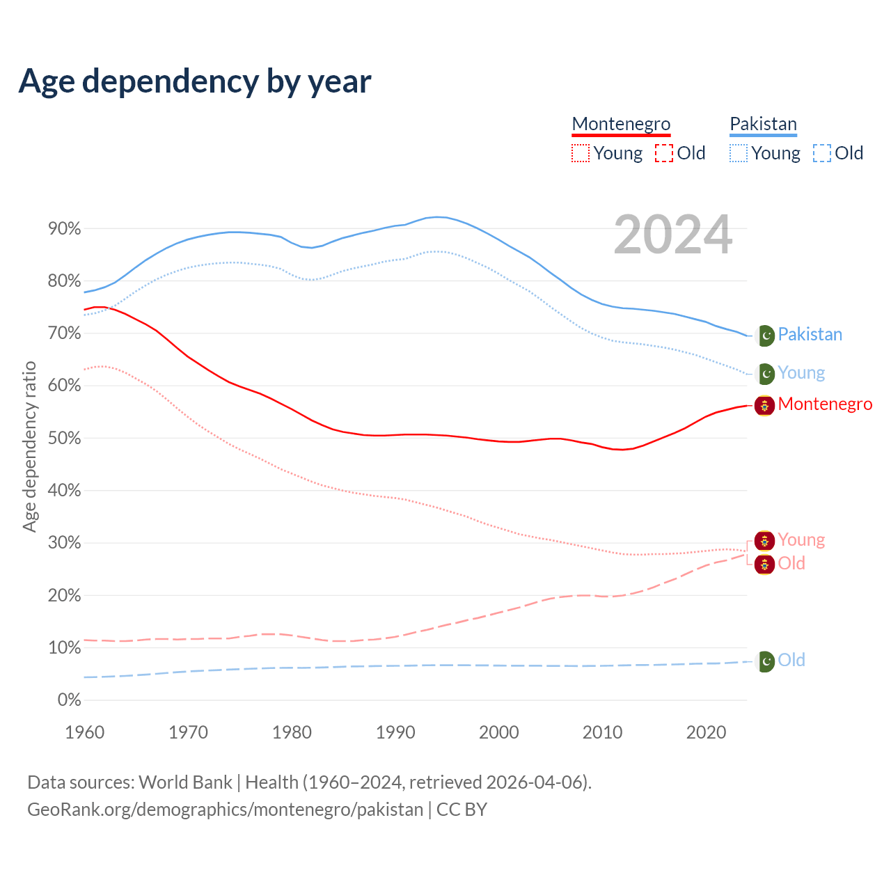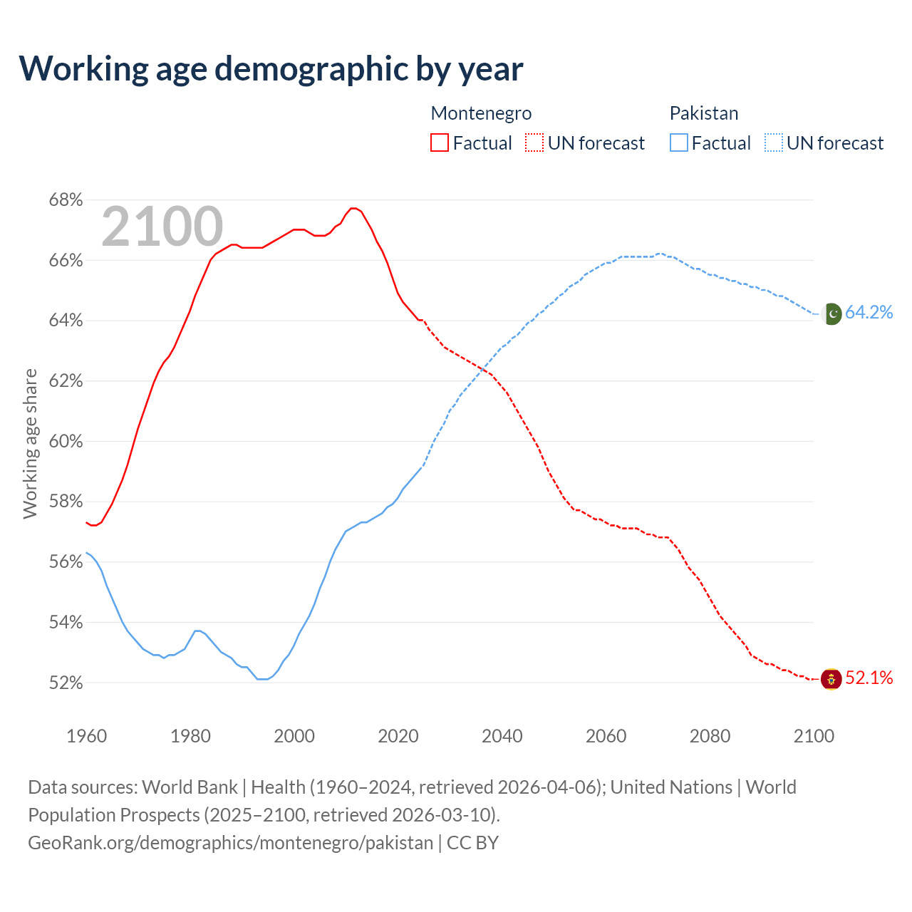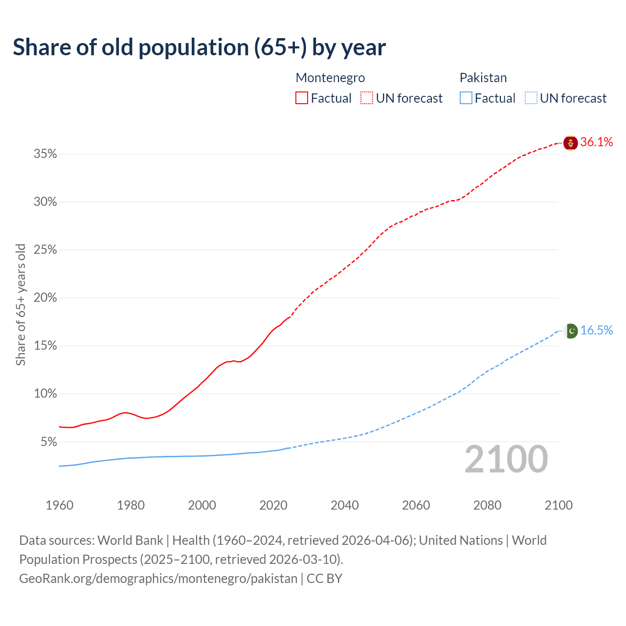 - The share of old-age demographic (65+) in Montenegro is 17.8% vs 4.28% in Pakistan.