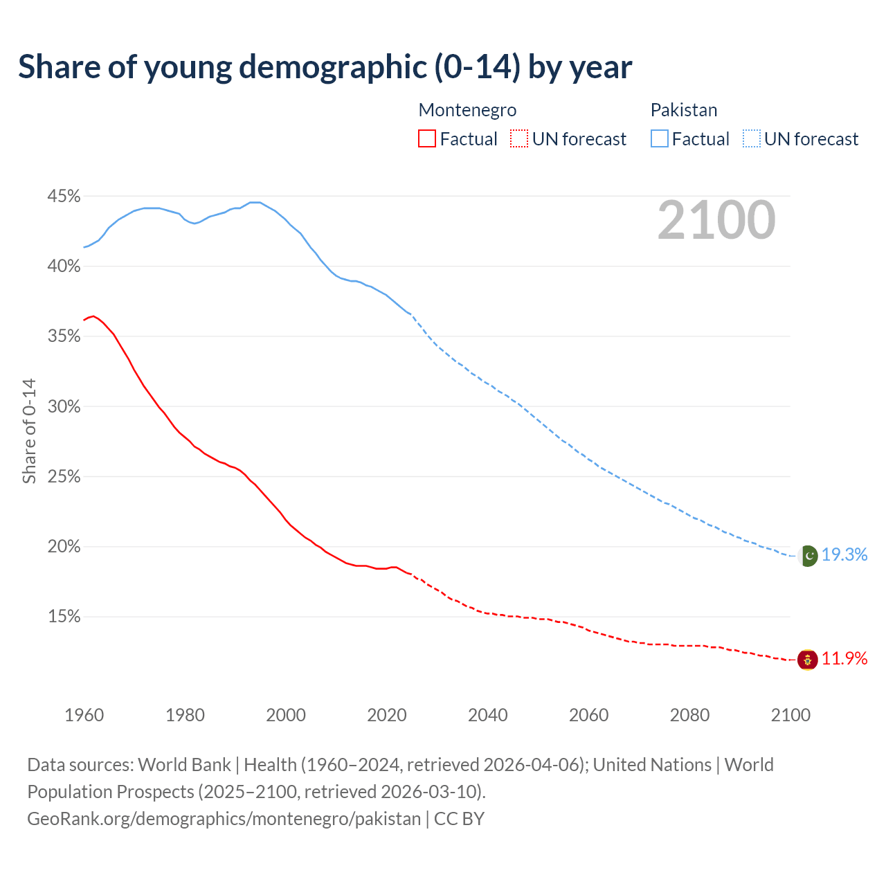 - The share of young demographic (0-15 years old) in Montenegro is 18.1% vs 36.7% in Pakistan.