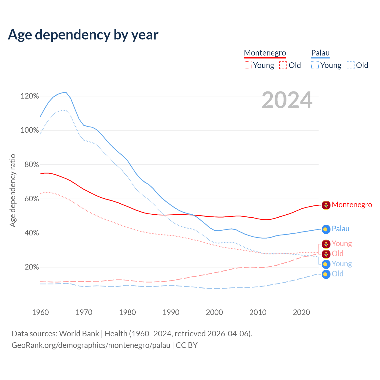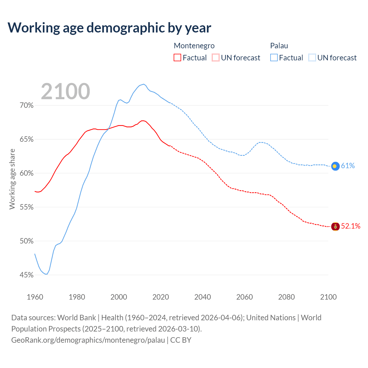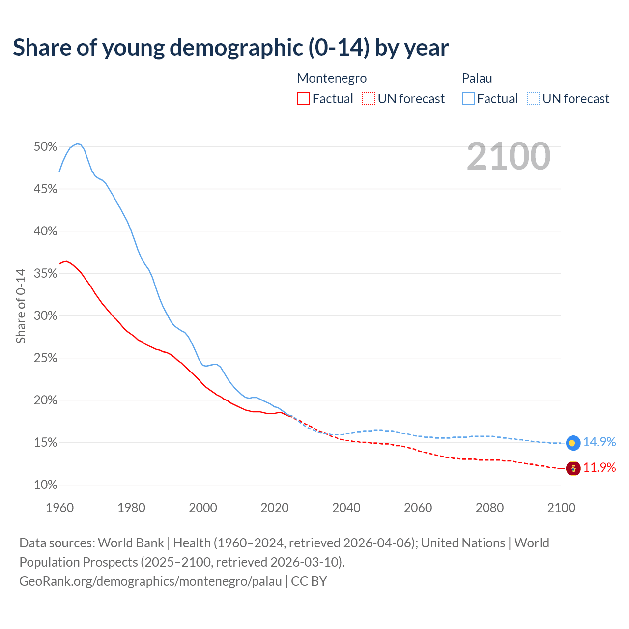 - The share of young demographic (0-15 years old) in Montenegro is 18.1% vs 18.2% in Palau.