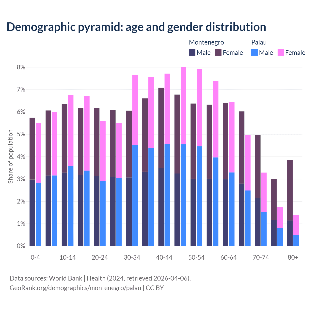 - Montenegro is ranked 45/196 by median age (oldest to youngest) vs 53/196 for Palau.