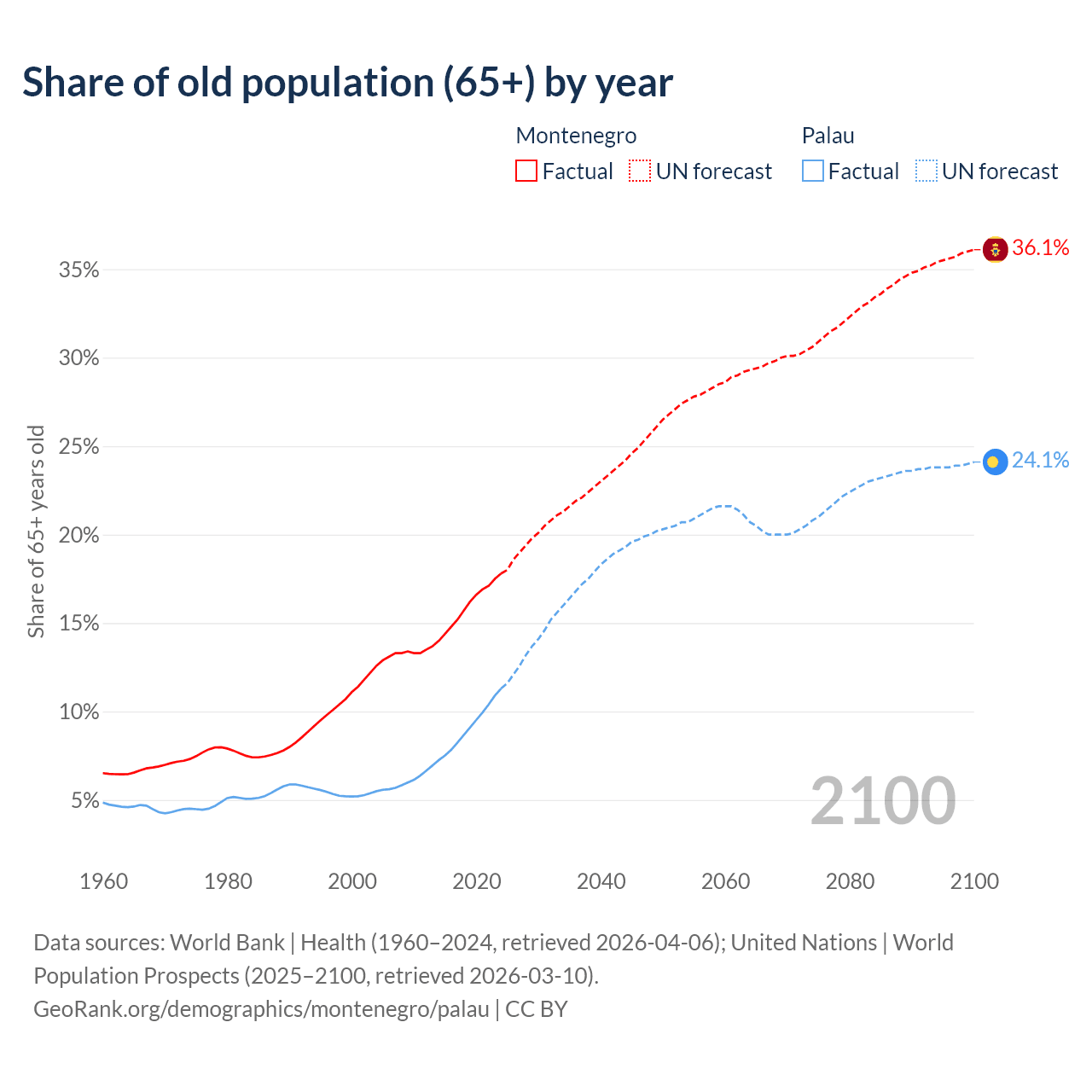 - The share of old-age demographic (65+) in Montenegro is 17.8% vs 11.3% in Palau.