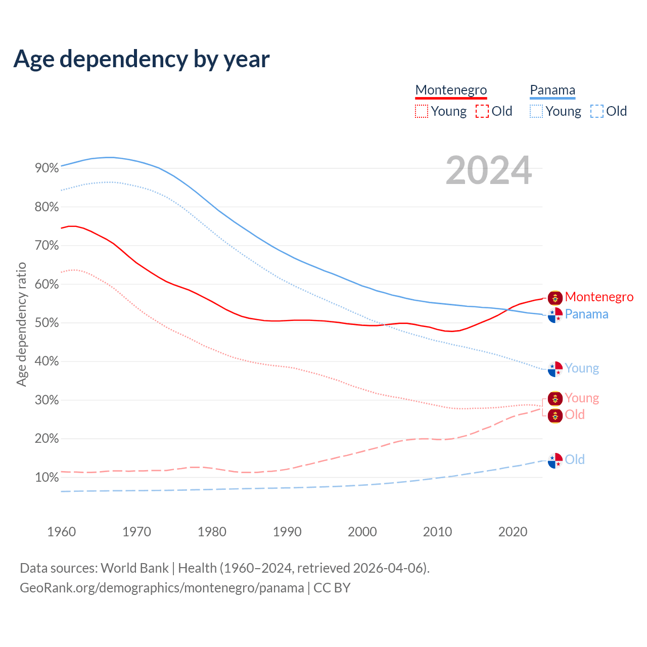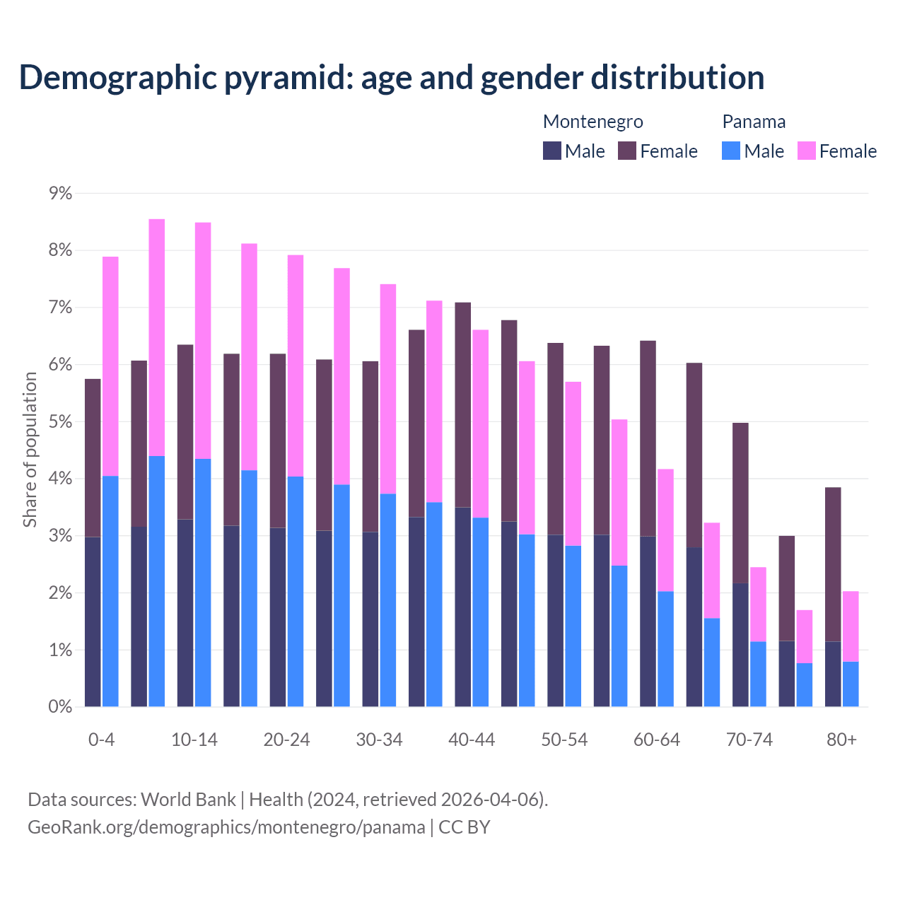 - Montenegro is ranked 45/196 by median age (oldest to youngest) vs 94/196 for Panama.