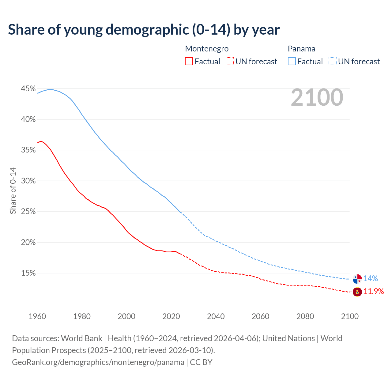 - The share of young demographic (0-15 years old) in Montenegro is 18.1% vs 24.9% in Panama.