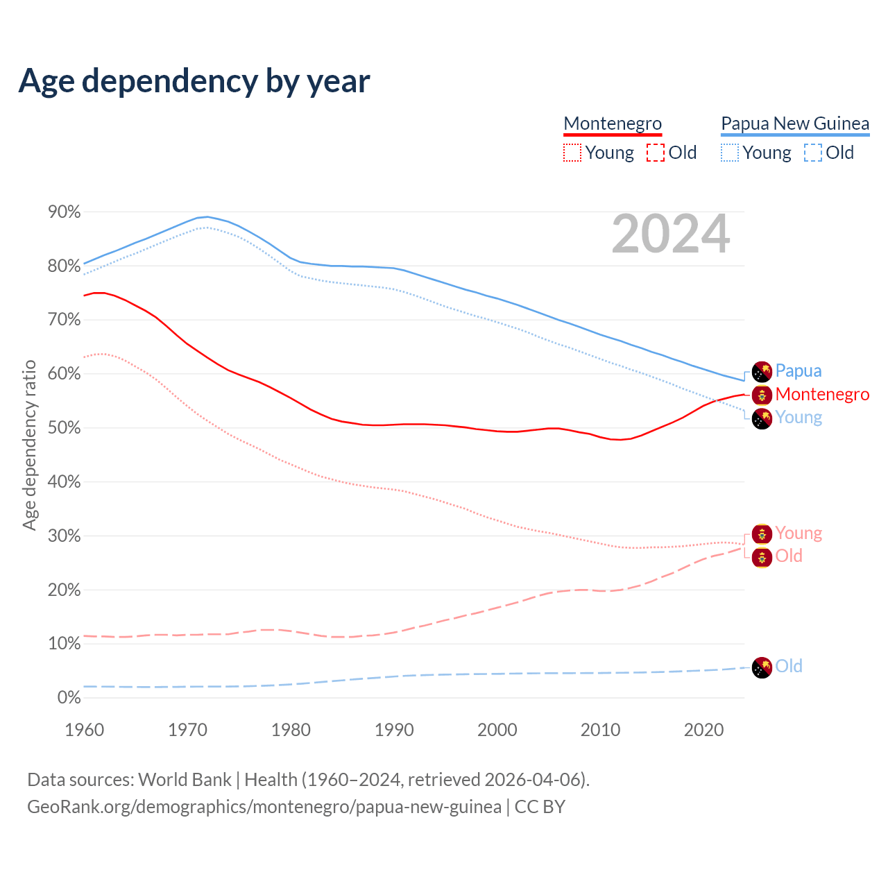 - The share of old-age demographic (65+) in Montenegro is 17.8% vs 3.46% in Papua New Guinea.