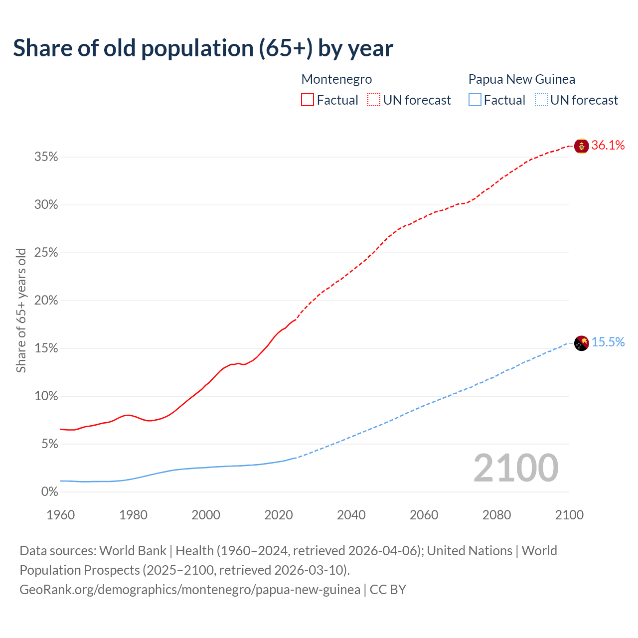 The share of older people aged 65 and over is 17.8% in Montenegro and 3.46% in Papua New Guinea. Life expectancy in Montenegro compared to Papua New Guinea .