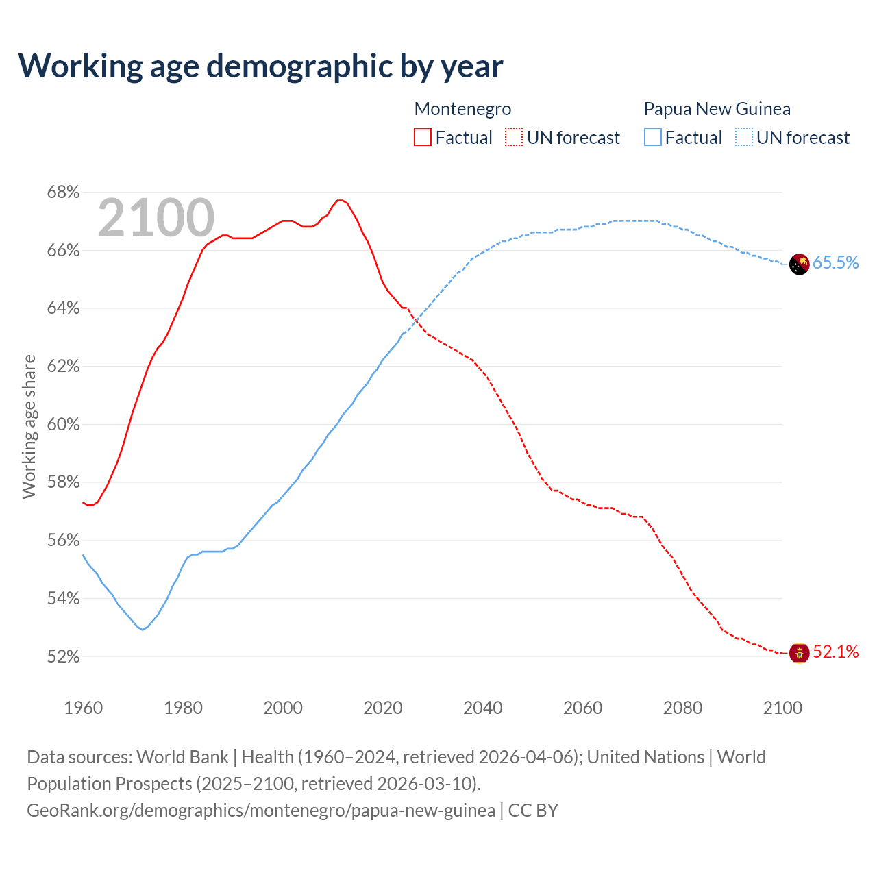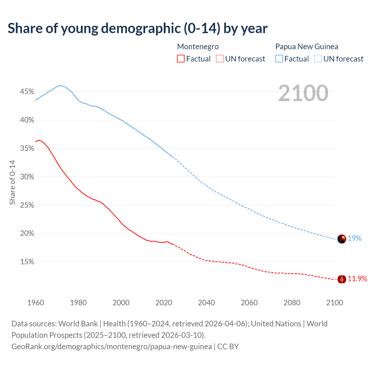 - The share of young demographic (0-15 years old) in Montenegro is 18.1% vs 33.5% in Papua New Guinea.