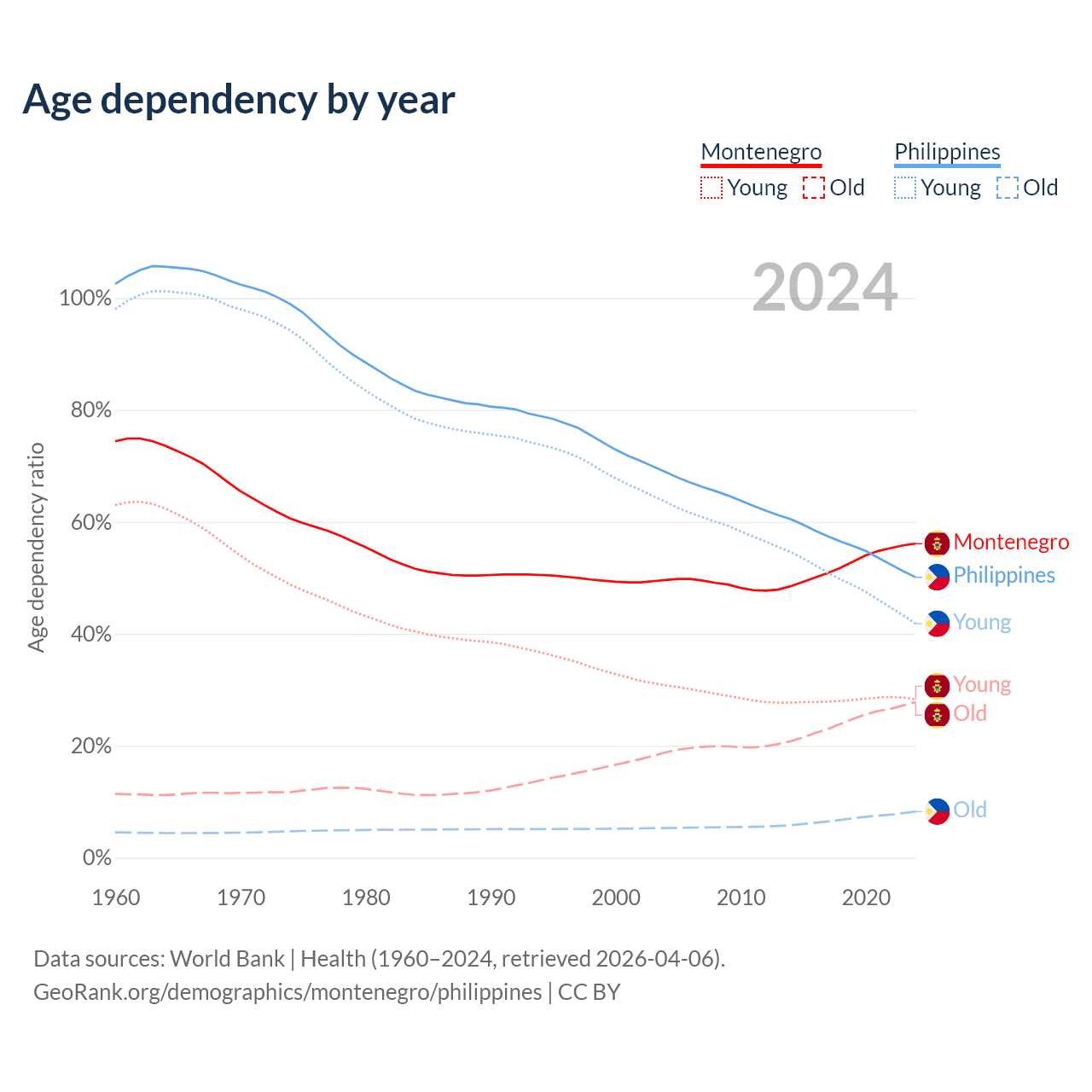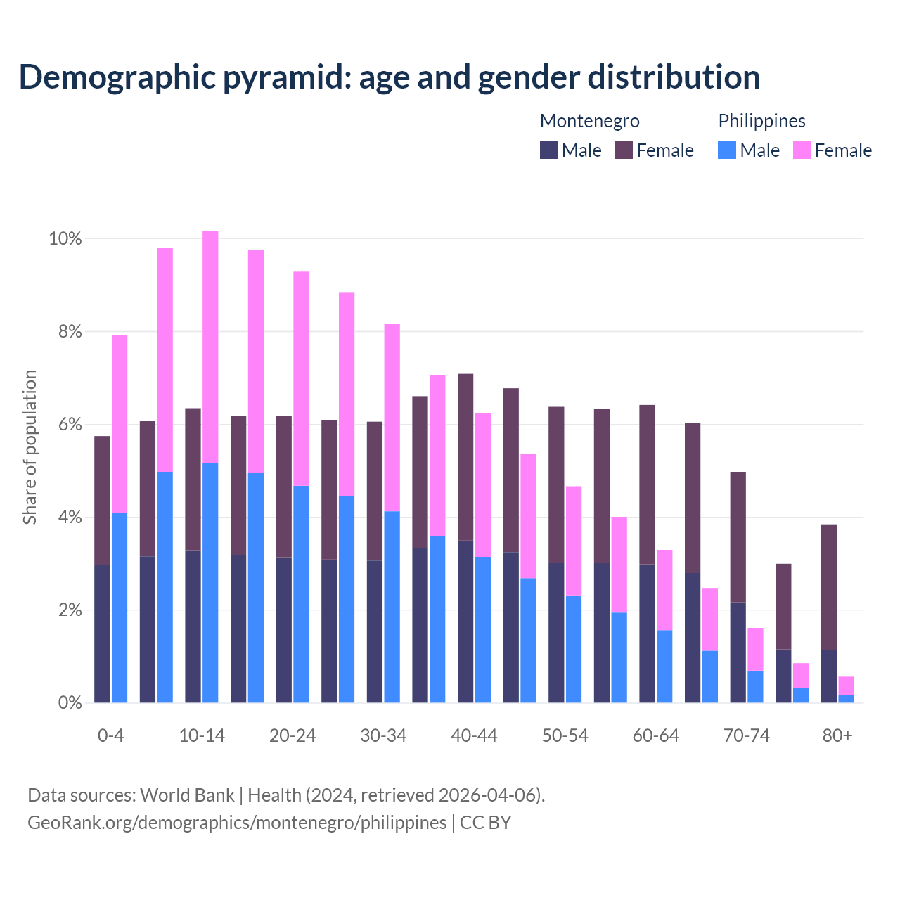 - Montenegro is ranked 45/196 by median age (oldest to youngest) vs 123/196 for the Philippines.