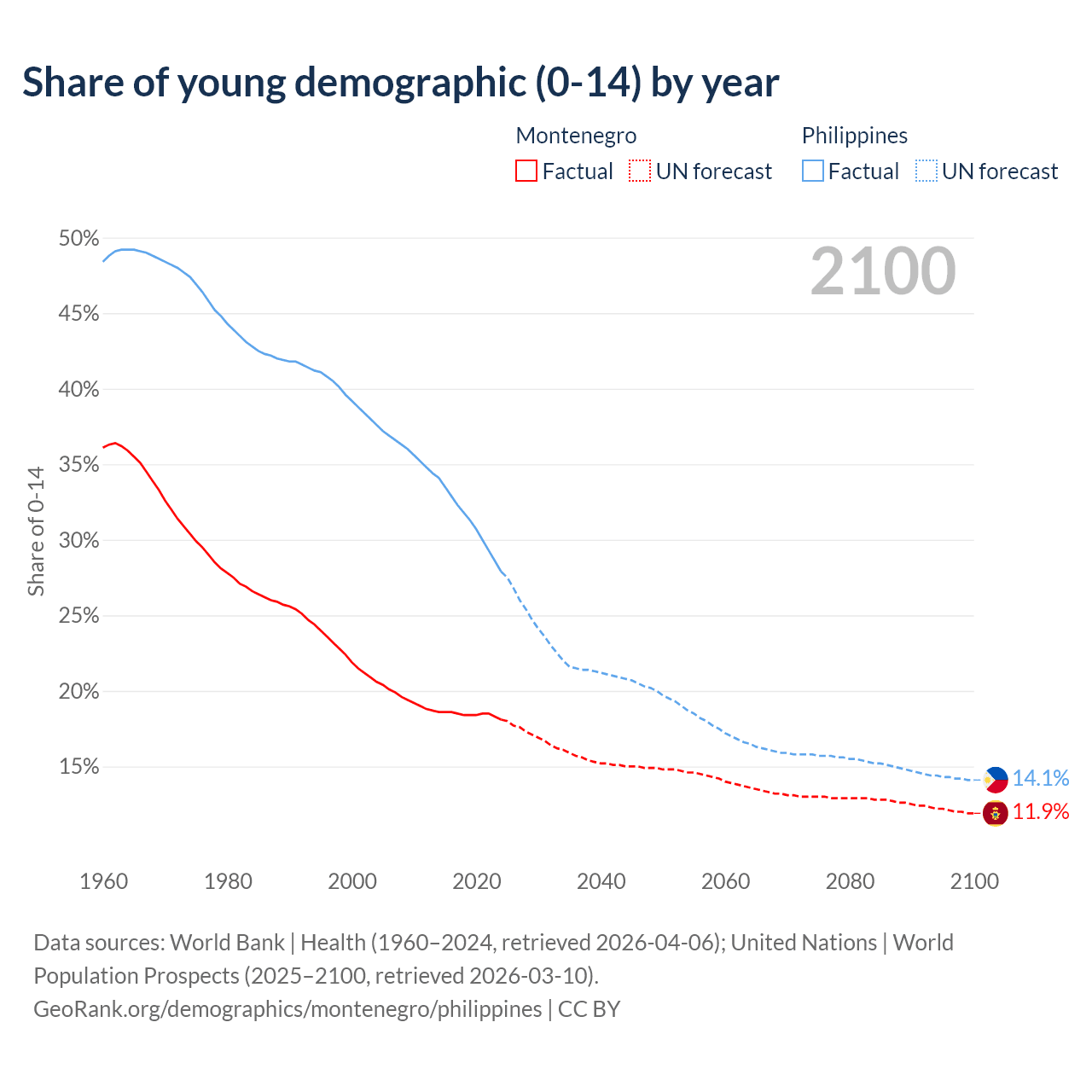 - The share of young demographic (0-15 years old) in Montenegro is 18.1% vs 27.9% in the Philippines.
