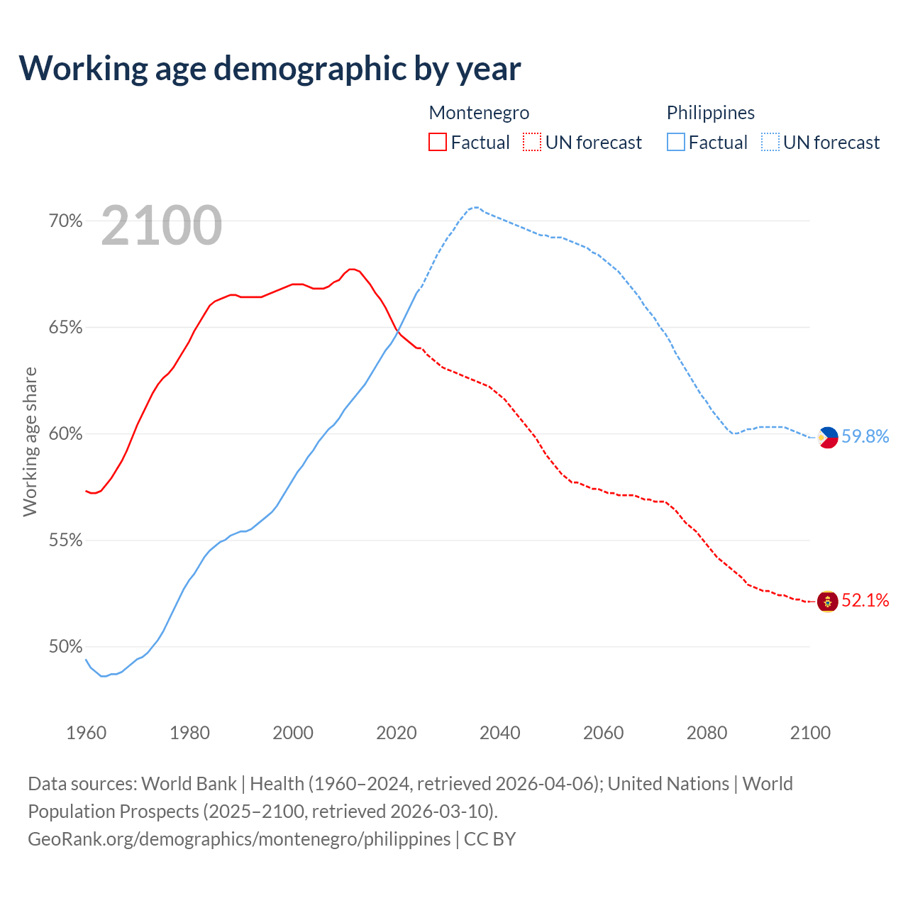 - Montenegro has 392K working age adults (aged 15-64) vs 78.6M in the Philippines.