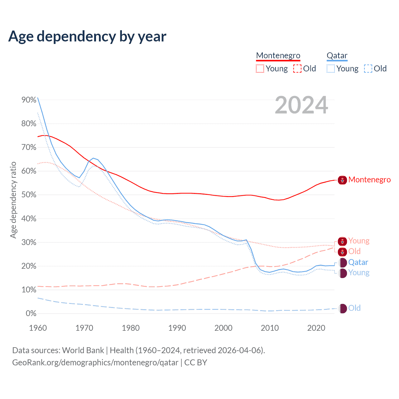 - Montenegro is ranked 45/196 by median age (oldest to youngest) vs 78/196 for Qatar.