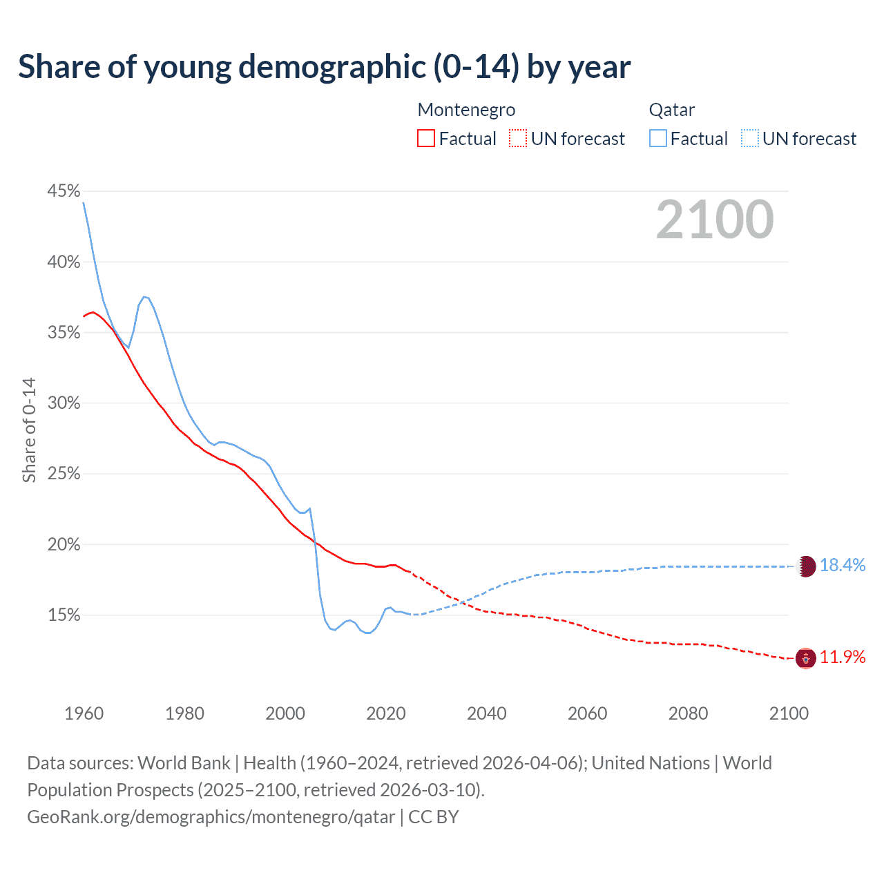 - The share of young demographic (0-15 years old) in Montenegro is 18.1% vs 15.1% in Qatar.