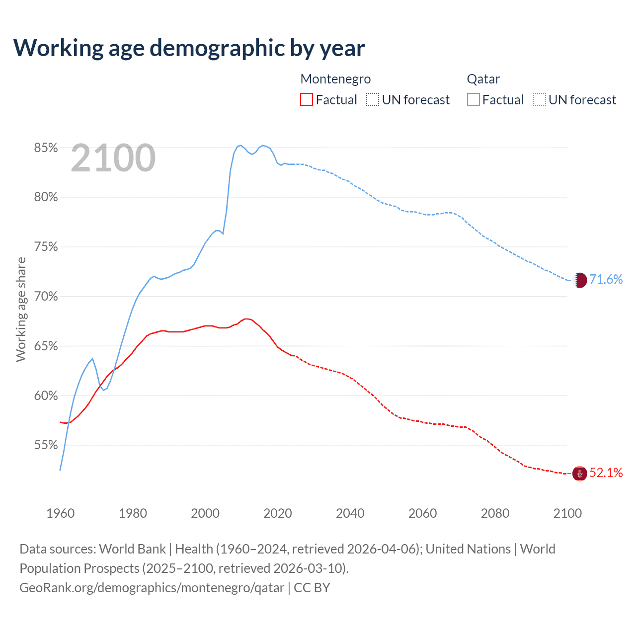 Median age Montenegro vs Qatar, 1960-2100
