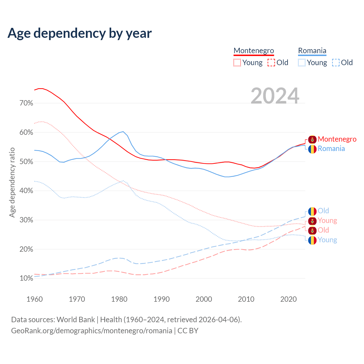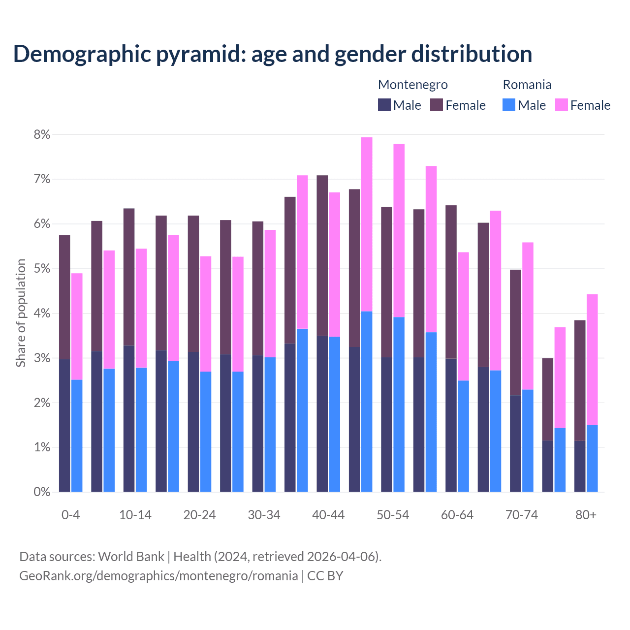 - Montenegro is ranked 45/196 by median age (oldest to youngest) vs 23/196 for Romania.