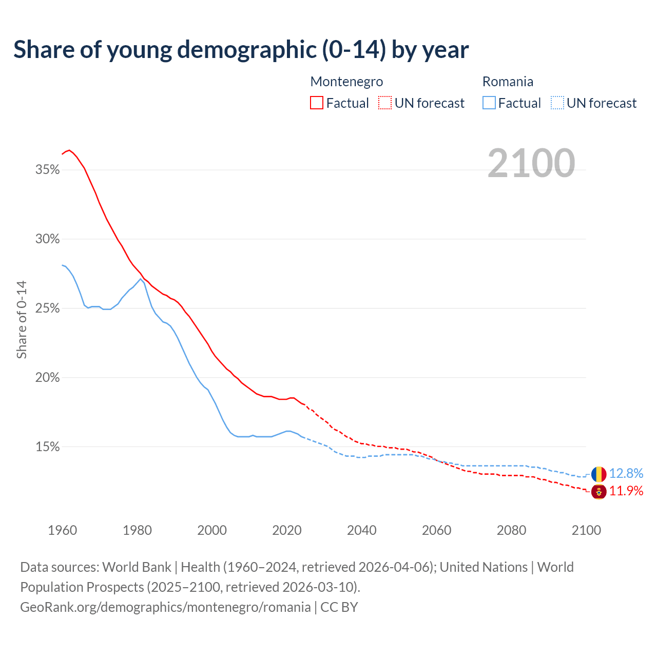 - The share of young demographic (0-15 years old) in Montenegro is 18.1% vs 15.7% in Romania.