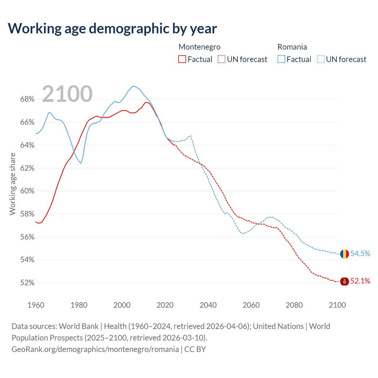 - Montenegro has 392K working age adults (aged 15-64) vs 12.1M in Romania.
