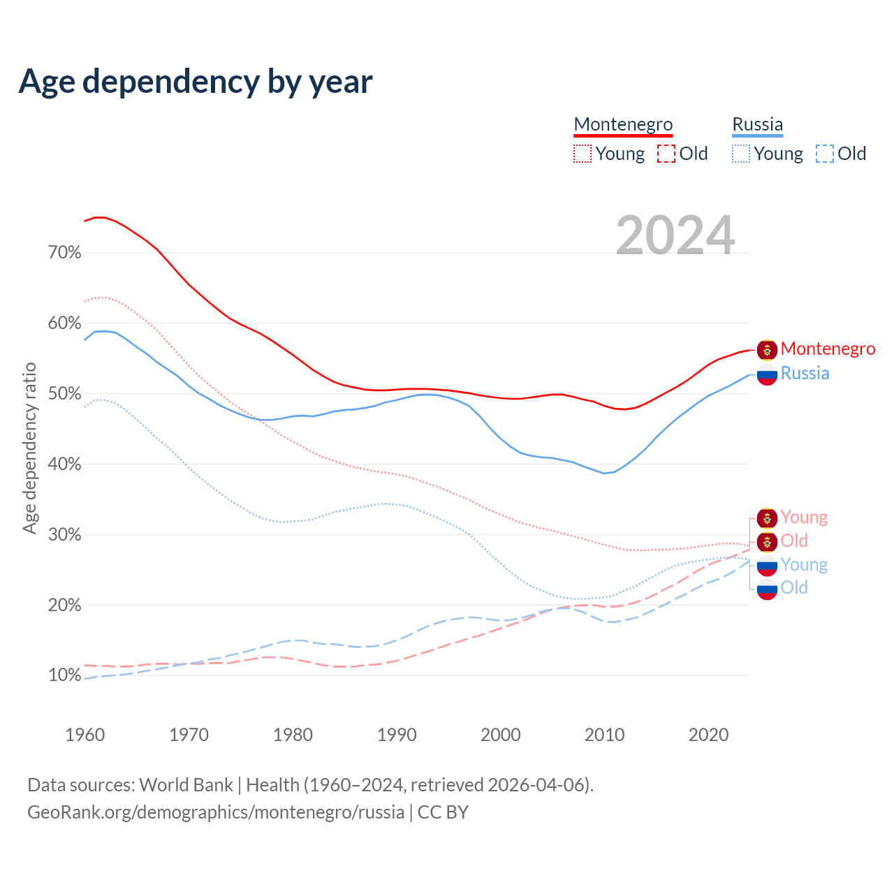- Montenegro is ranked 45/196 by median age (oldest to youngest) vs 42/196 for Russia.