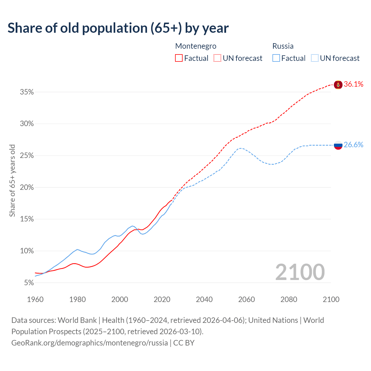 The share of older people aged 65 and over is 17.8% in Montenegro and 17.2% in Russia. Life expectancy in Montenegro compared to Russia .