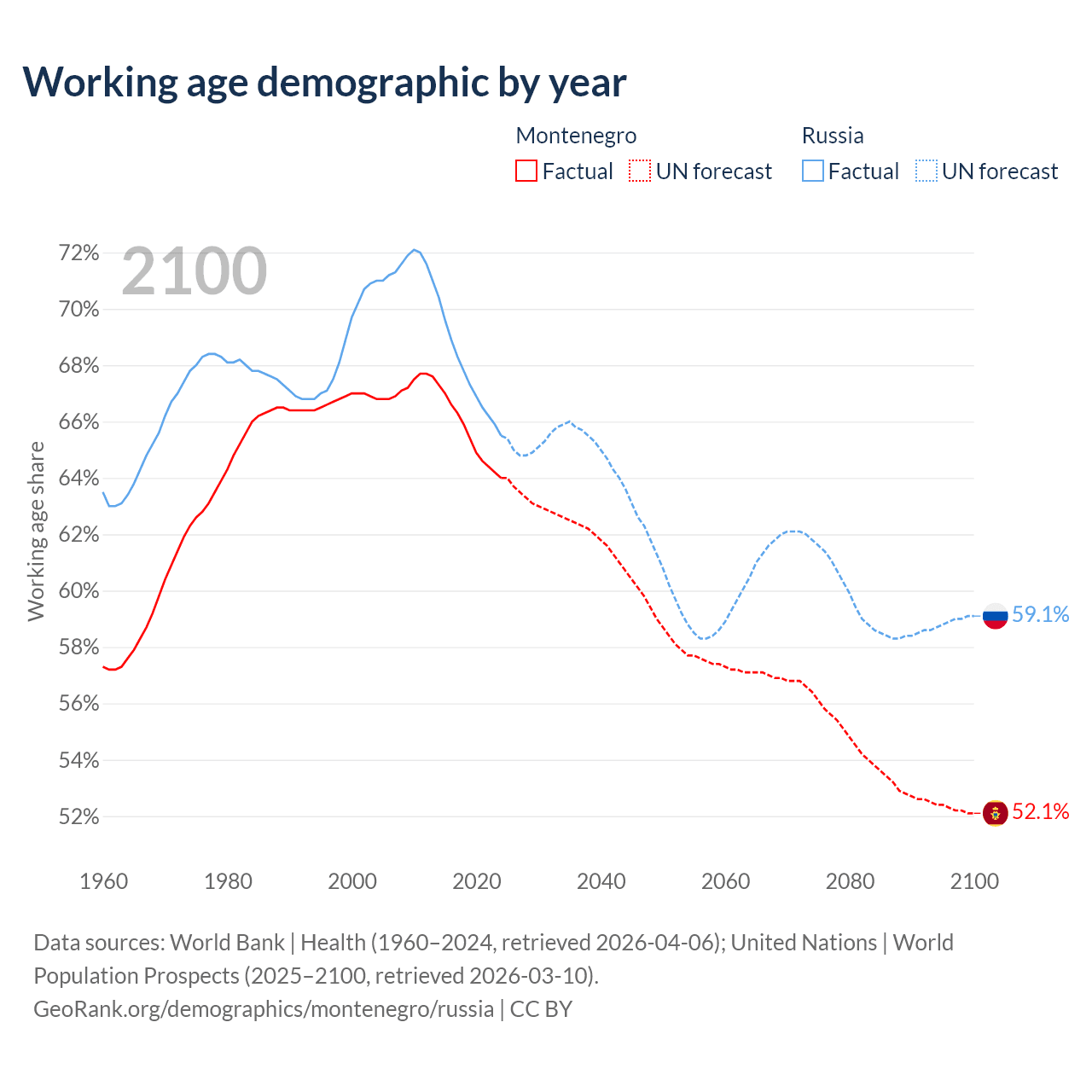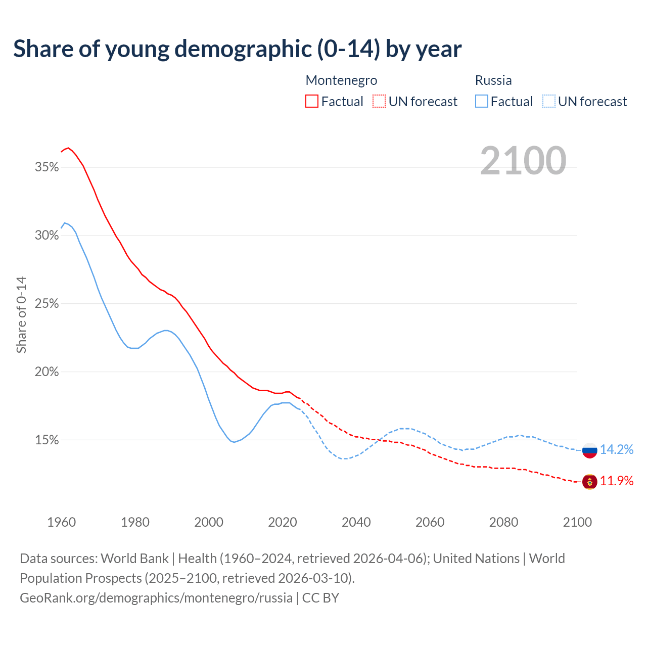 Median age Montenegro vs Russia, 1960-2100