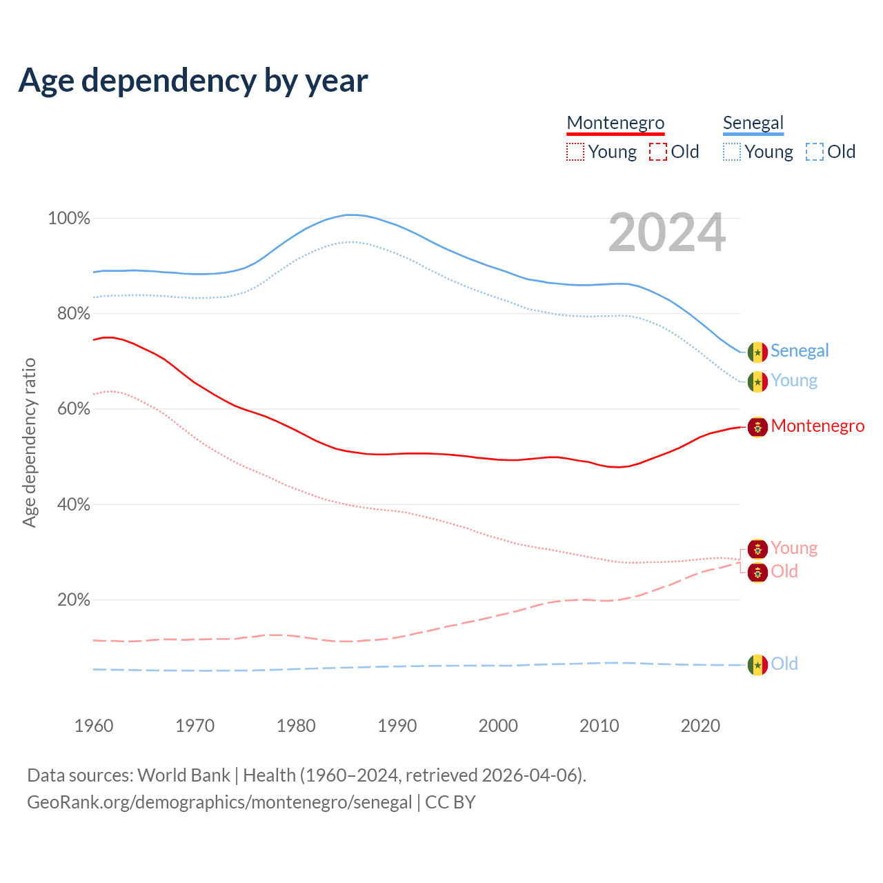 - The share of old-age demographic (65+) in Montenegro is 17.8% vs 3.62% in Senegal.