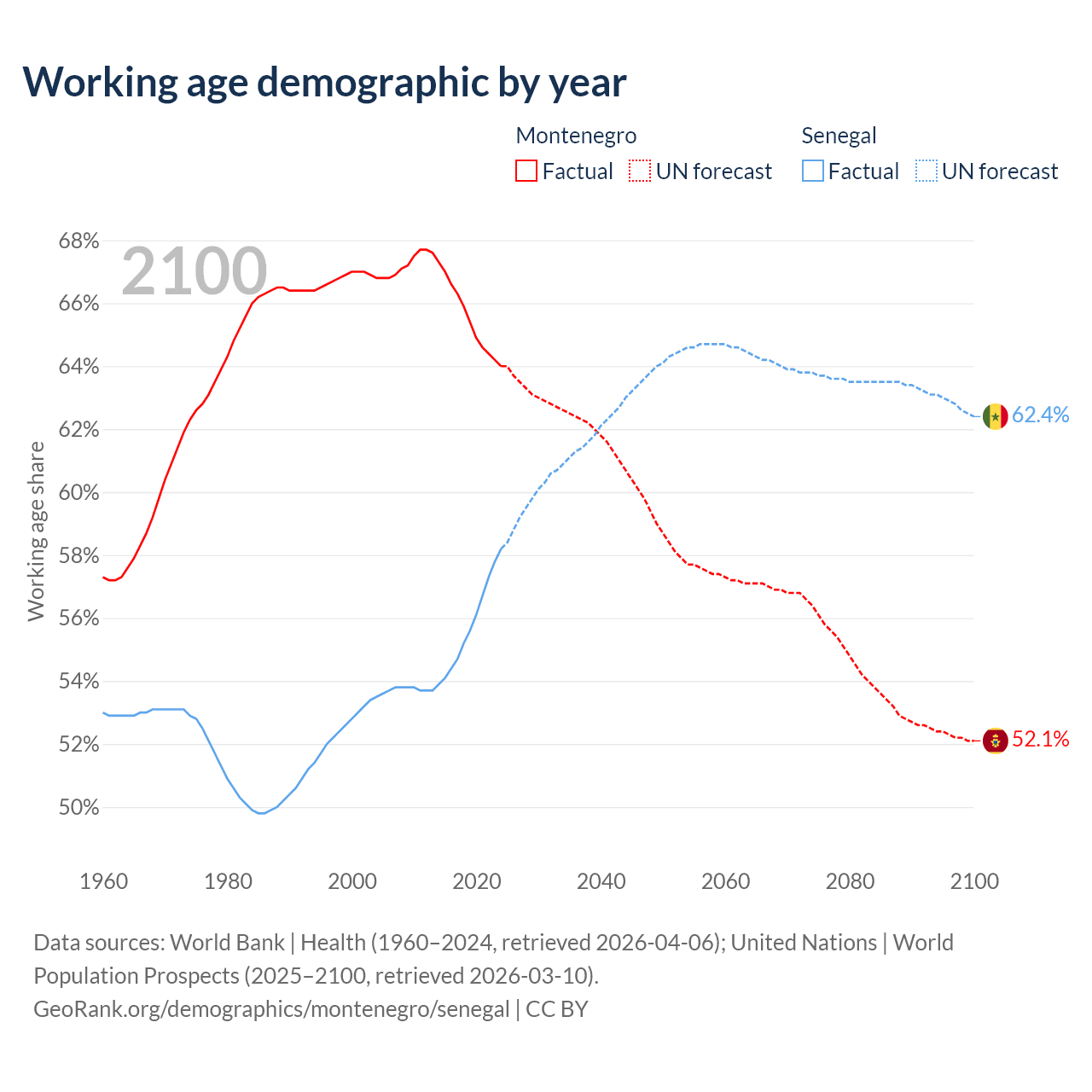 Median age Montenegro vs Senegal, 1960-2100