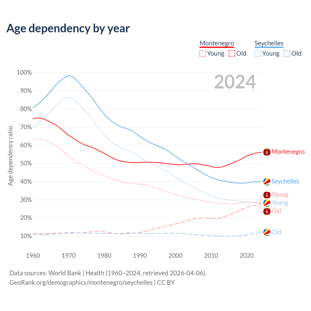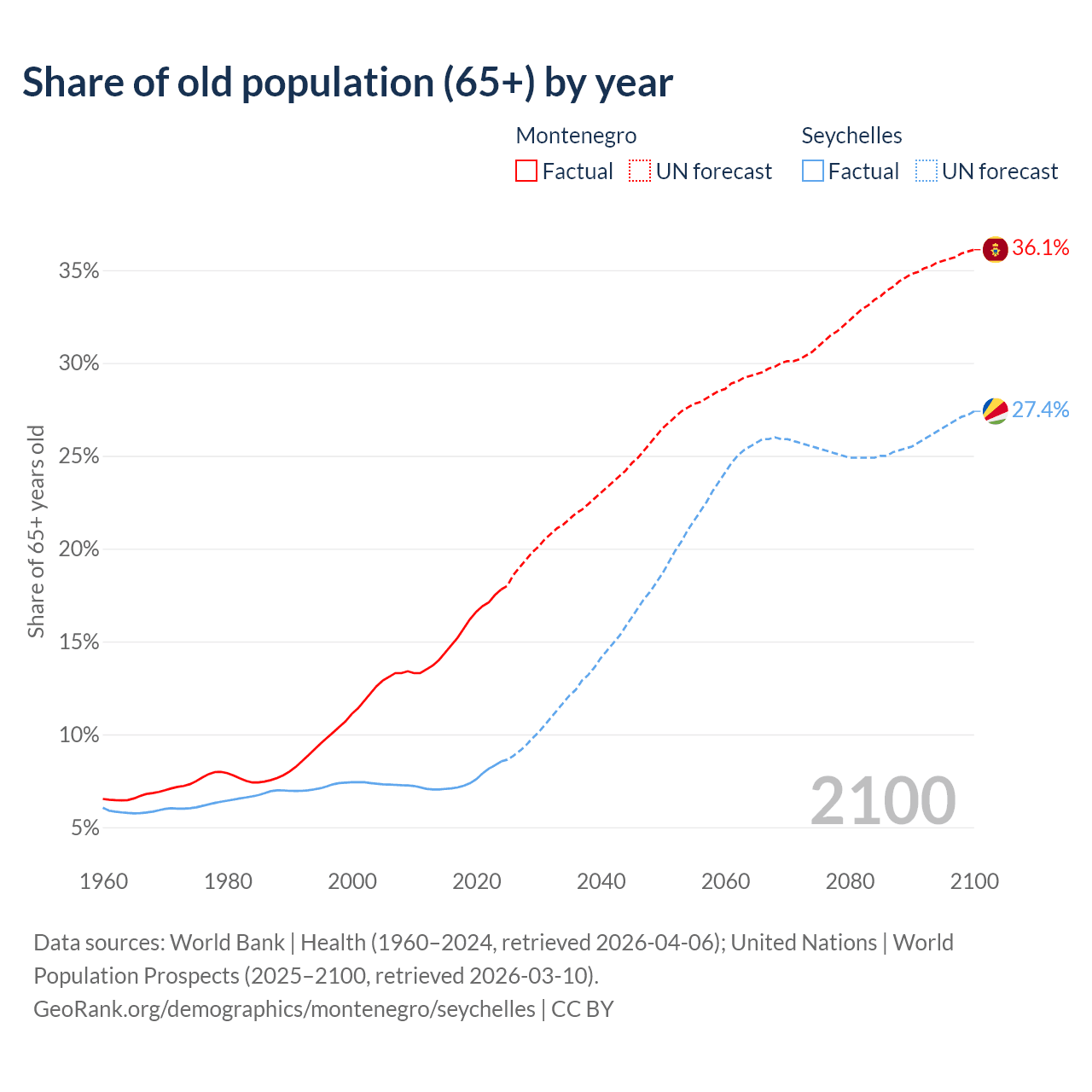 - The share of old-age demographic (65+) in Montenegro is 17.8% vs 8.54% in the Seychelles.