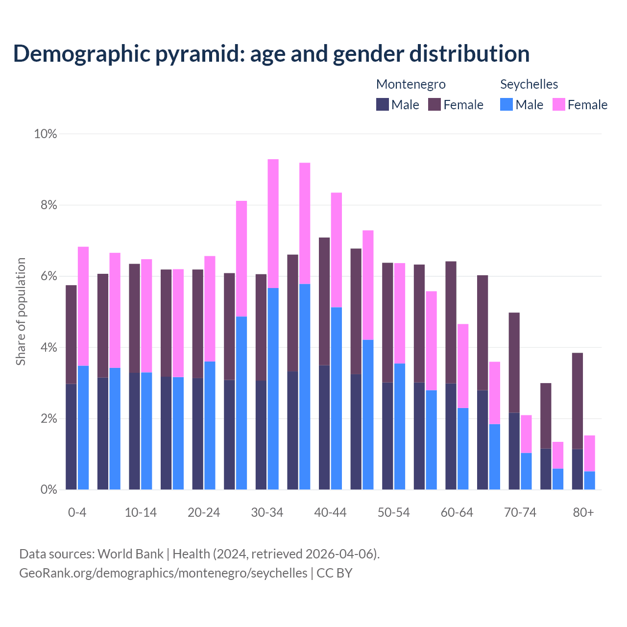 - As of 2026, the population of Montenegro is 612K vs 126K in the Seychelles - 4.85 times difference.